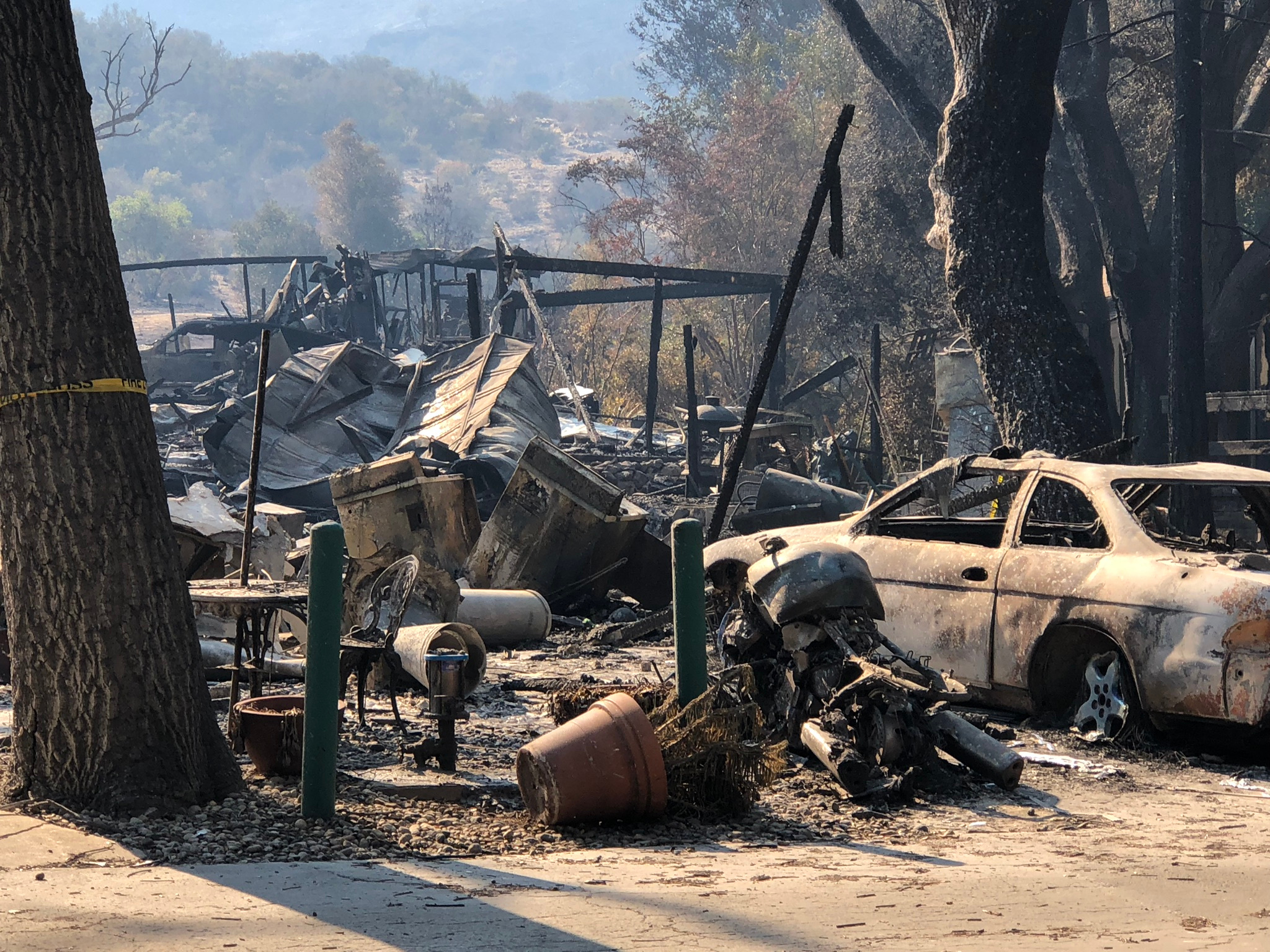 Burnt car and structure in the urban-wildland interface zone near the Los Angeles County – Ventura County line in Southern California following the November 2018 Woolsey Fire. (Photograph by Glen MacDonald – used by permission)