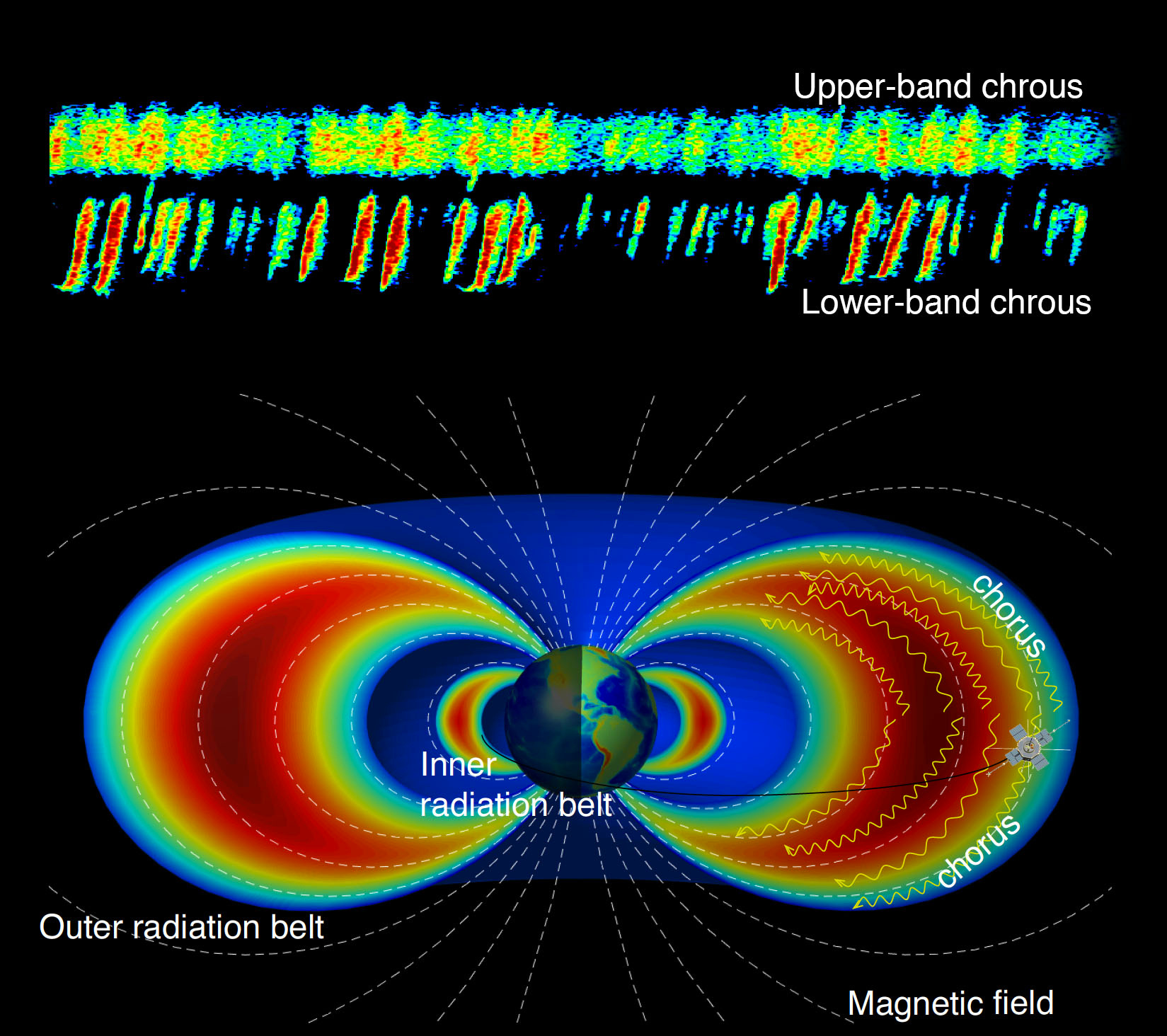 In the Earth’s outer radiation belt, which consists of relativistic particles moving with speeds that are close to the speed of light, one of the most beautiful “musical sounds” in space is produced, namely, chorus waves. Their existence was known even before the launch of the first satellite, because they can propagate roughly following the magnetic field to the ground. Their audio sounds like the dawn chorus of birds and thus got its name. In the space age, satellites were able to directly detect those emissions in space. Early satellite measurements 50 years ago discovered that chorus emissions typically consist of two frequency bands, the upper-band and the lower-band, separated by a gap at half electron gyro-frequency (electrons gyrate around the magnetic field). The origin of the two-band signature of chorus has since then been intensively studied by many scientists.
