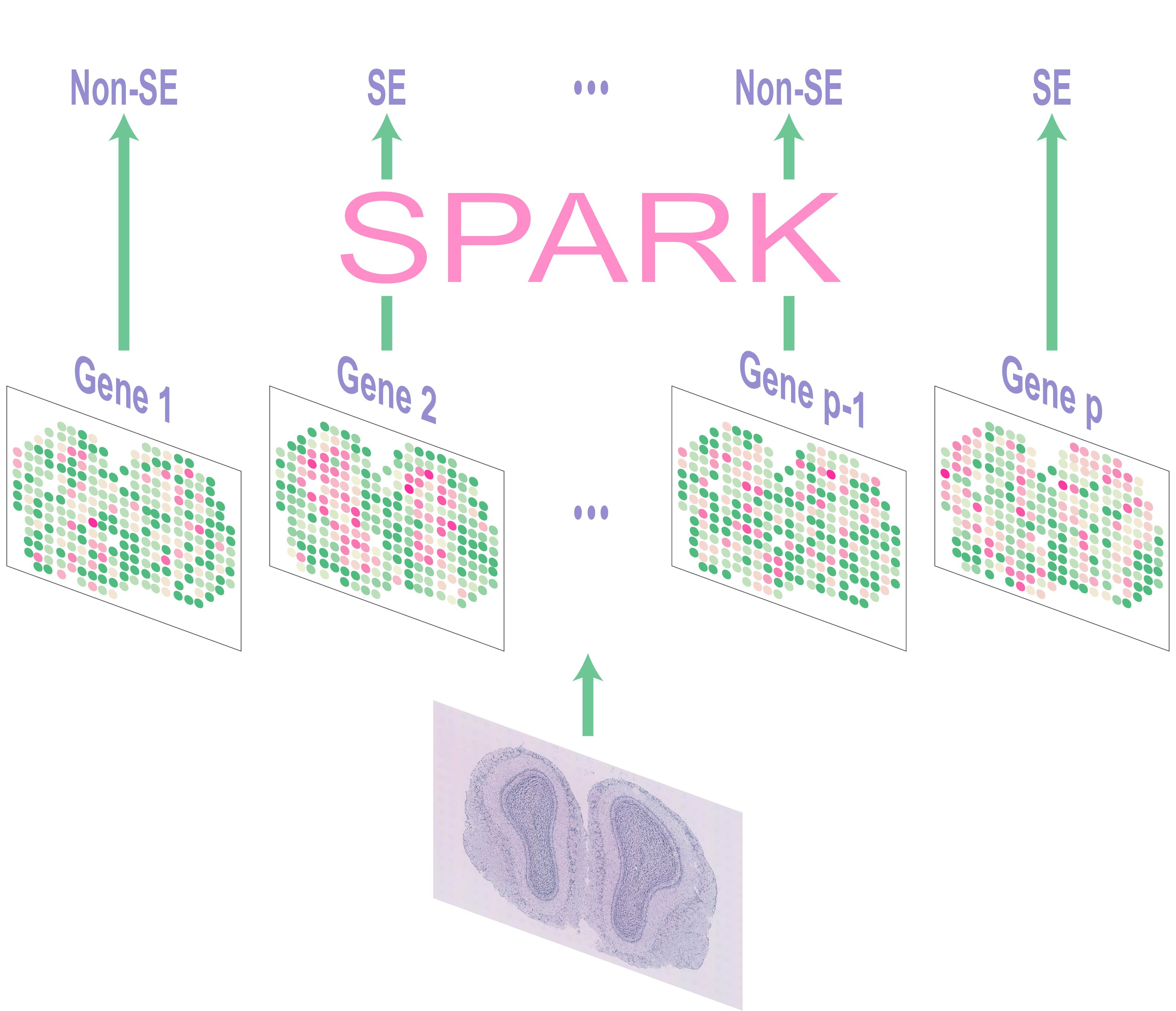 Figure 1: SPARK performs rigorous statistical test to identify SE genes in spatially resolved transcriptomic studies. Bottom: Hematoxylin-and-eosin staining of olfactory bulb, where the expression levels of genes are measured. Middle: Spatial expression pattern of each individual gene. Top: SPARK examines one gene at a time and produces a calibrated p-value testing its SE evidence.
