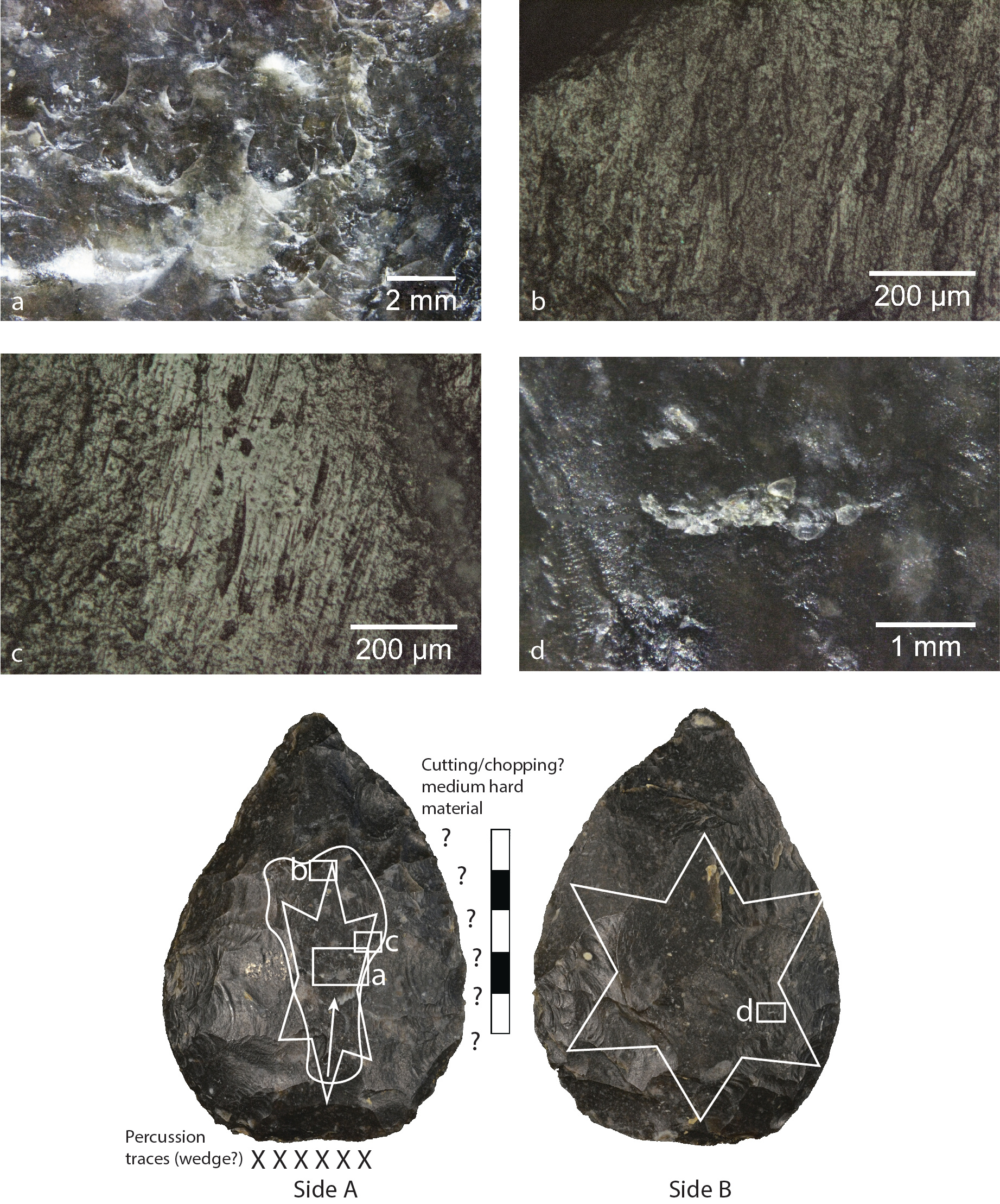 At around this point in 2013, I had another fortuitous introduction to a new colleague that set into motion the events that led to the new Scientific Reports paper. Marie Soressi had just arrived at Leiden University to begin her tenure as Assistant Professor of Palaeolithic Archaeology (recently promoted to full professor). Being what many might consider the ‘Queen of the MTA’—i.e. the Mousterian of Acheulean Tradition, a late Middle Palaeolithic cultural variant known for its large, curated bifacial tools (see Soressi, 2002; 2004)—I of course began describing my hypothesis that these types of tools may be fertile hunting grounds for fire making traces. “Do you know of any bifaces bearing weird mineral traces?” I asked while showing her some micrographs of fire making traces from my experiments. “As a matter of fact, I believe I do!” she replied. Jaw, meet floor.