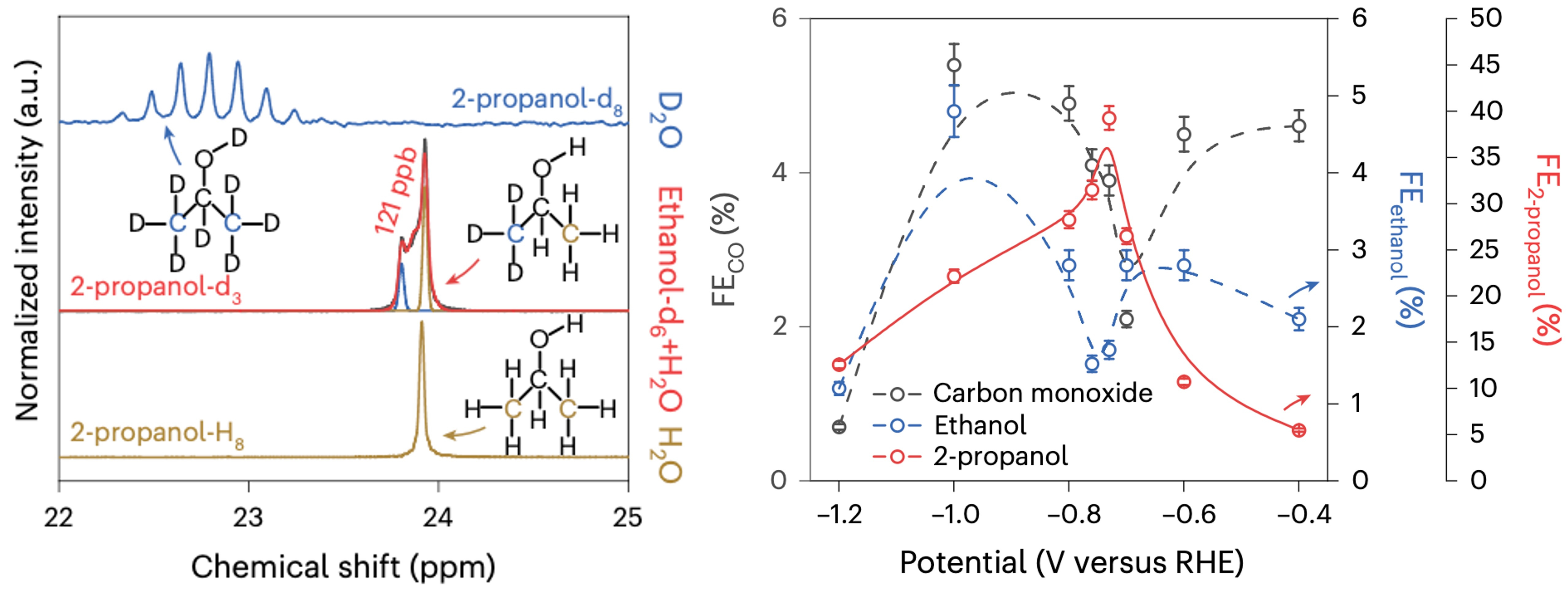 Then it comes to the experiment, as all the CO2RR researchers, especially guys who work with H-cell know. Before each experiment, there is an essential but time-consuming process to saturate the electrolyte with CO2 by bubbling for around 30 mins. The idea comes from once I was preparing sparkling water by pushing a button 3 or 5 times and the CO2-saturated water is ready in 10 seconds. Why do not people use sparkling water makers to saturate the electrolyte to save some time? I tried it, and indeed, the saturation process was significantly reduced. However, it seems that the reaction was performed in a CO2 "super satureaturated" electrolyte and even the production of 2-propanol (a very rare product for CO2RR which has only been reported by a few papers) was detected by further NMR analysis. So definitely we found something very interesting and different from what we expected.