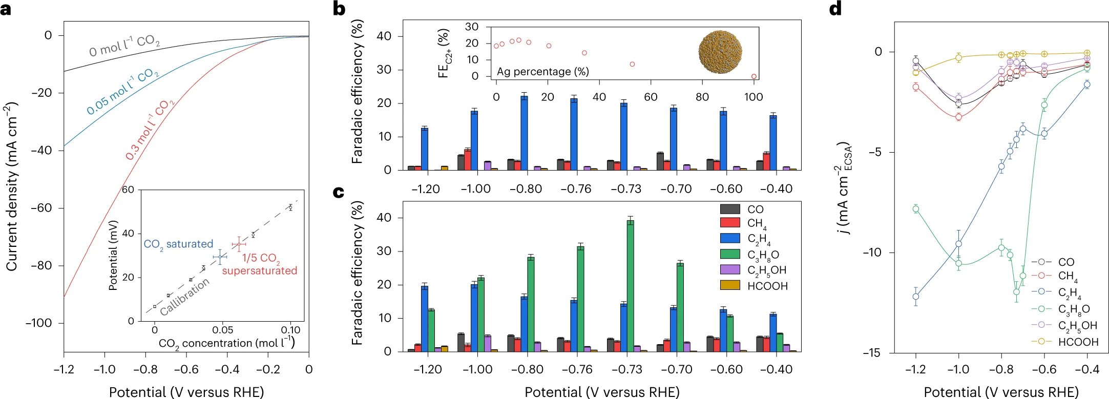 According to Henry’s law, under constant temperature, the amount of a given gas that dissolves in a given volume of liquid is directly proportional to the partial pressure of gas in equilibrium with the liquid. So we measured the CO2RR performance under elevated applied pressures and introduced a new CO2 supersaturation strategy for the direct conversion of CO2-to-C3 products. Performing the electro-reduction of CO2 under supersaturation conditions orients the reaction pathway towards the formation of 2-propanol. The mechanism responsible for the high selectivity towards the formation of C3 products was explored in detail using operando Raman, FTIR and hXAS spectroscopy together with ex-situ isotopic labelling experiments and DFT calculations. These results led to the identification of the role of *CO for C1-C1 coupling and *OCH2CH3 as a key intermediate for the selective formation of 2-propanol. Our experimental and calculation results highlight the importance of the CuAg alloy catalyst on the formation of 2-propanol and emphasize the advantage of the supersaturation strategy to increase the local CO2 concentration during the CO2RR, which improves the formation rate of *CO intermediates.