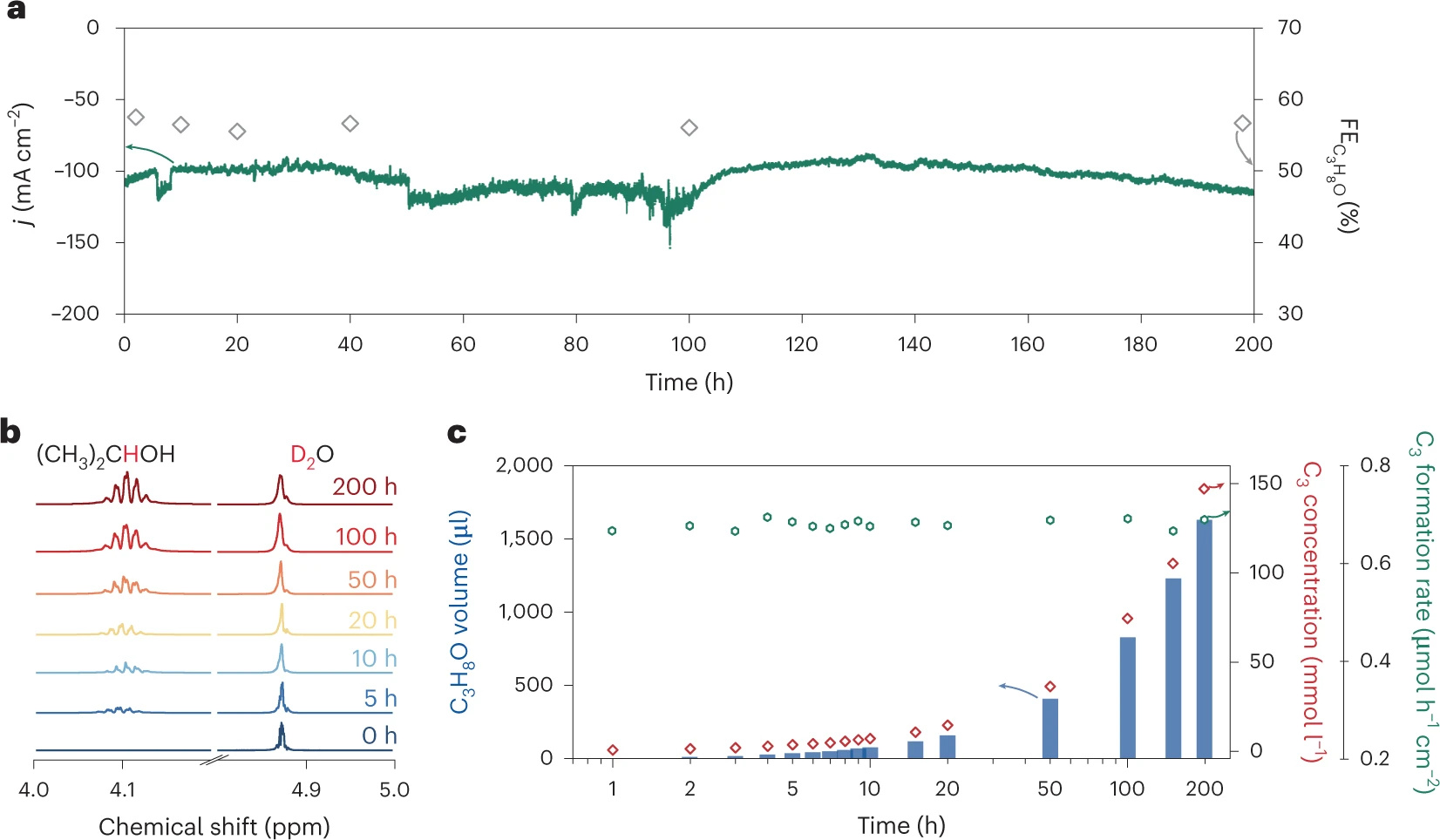 Finally, we achieved a record-high selectivity with the Faradaic efficiency for 2-propanol of 56.7 %, a specific current density of 59.3 mA cm-2, and operating stability for 200 hours at 10 bar (optimized CO2 pressure and concentration). The investigations provide the opportunity for fine-tuning the reaction pathway by controlling the local CO2 concentration and the formation rate of the catalytic favourable intermediates. We believe that the supersaturation strategy holds promise for applications in large-scale carbon fixation, the production of high-market value, energy-dense multicarbon molecules and the storage of energy in the form of chemical fuels.