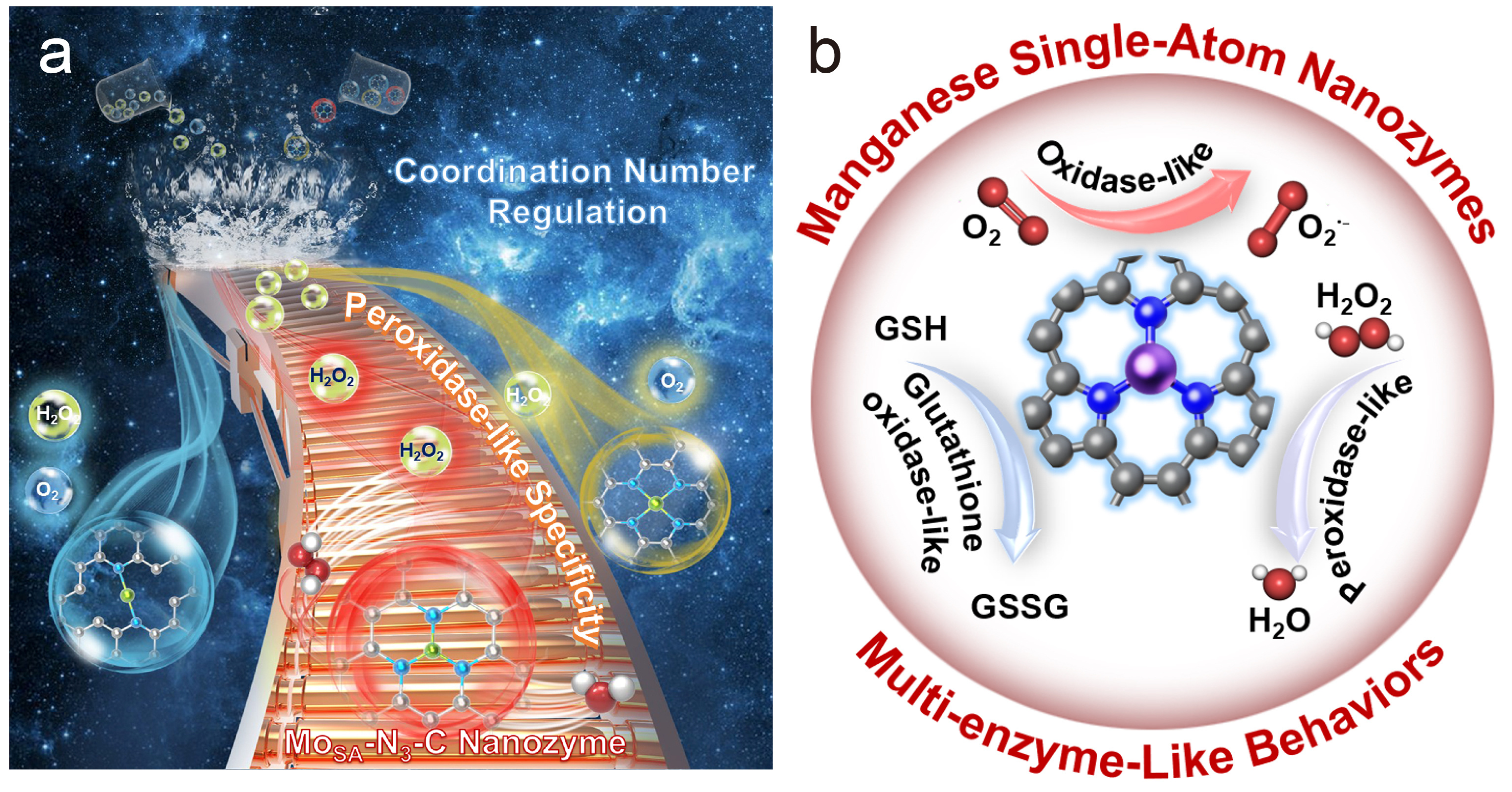 Figure 1 Schematic diagram of coordination number regulation for (a) the peroxidase-like specificity of Mo SAzymes and (b) the multi-enzymatic activities of Mn SAzymes3, 4.