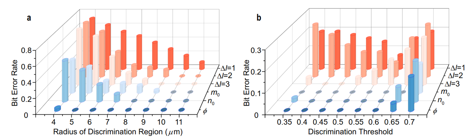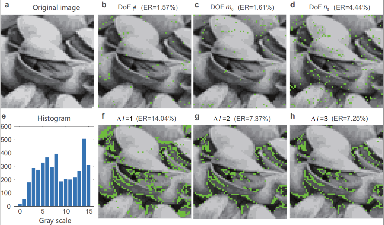 In addition to the novel concept, we validate the potentials of spatially multiplexed MVGB as high dimensional information carriers, by proof-of-concept experiments of the tri-DoF mode (de)multiplexing. Notably, we make the challenging demultiplexing task of tri-DoF modes possible, by proposing a novel approach based on conjugated modulation that can fully resolve the ray-wave duality state, removing the long-standing obstacle in the identification and sorting of ray-wave geometric beam that has prohibited its progress. Importantly, the demultiplexing results demonstrate another distinct advantage of MVGB modal basis, in terms of generating much lower bit error rates caused by center offset (Fig. 2 and Fig. 3a) and background noise (Fig. 3b), compared with OAM basis. Furthermore, we demonstrate the free-space data transmission by shift-keying method using the tri-DoF MVGBs. The data packet used is a 4-bit 16-level grayscale image composed of 64 × 64 pixels with an equalized gray-level histogram, as shown in Fig. 4. The novel carrier reliably transmits the image, outperforming the general OAM beams in terms of pixel error rate (ER).