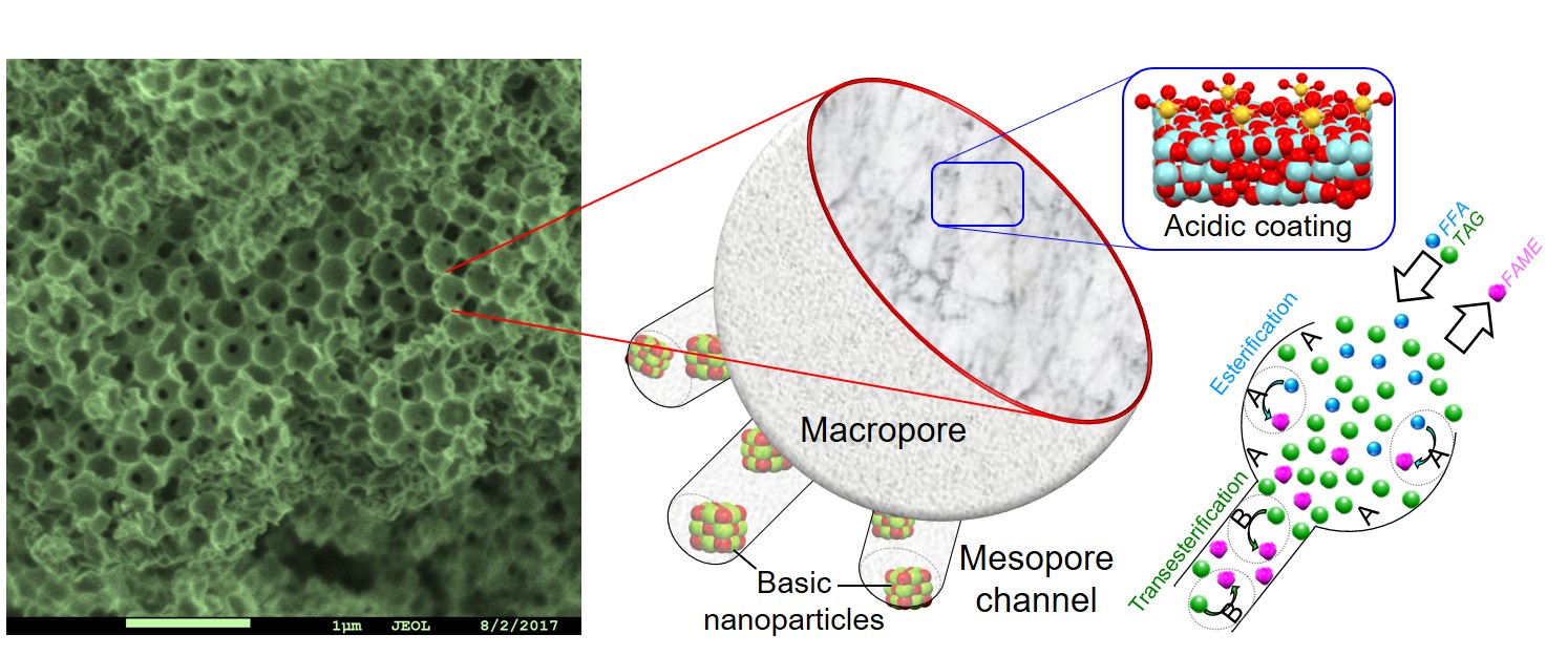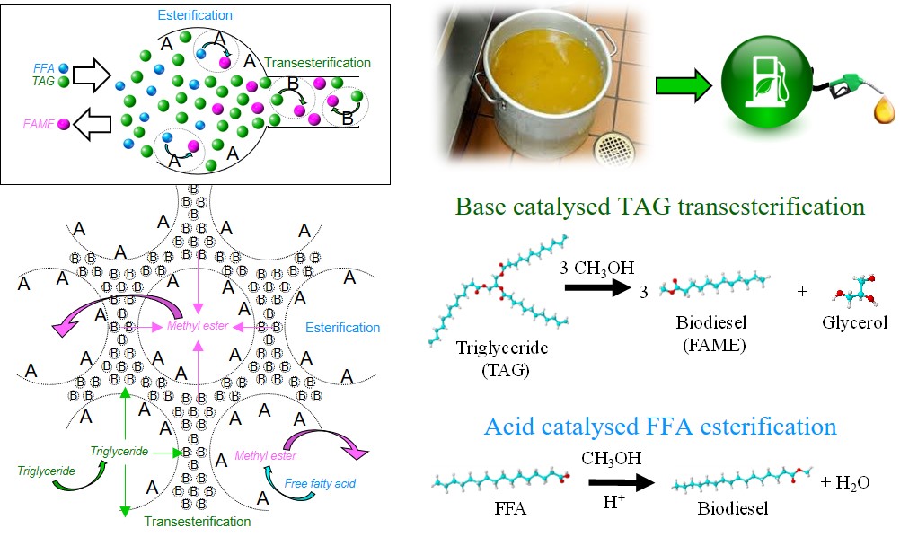 The unique benefit of locating mutually incompatible active sites within catalyst particles was demonstrated for one pot transesterification of a triacylglyceride (TAG) in the presence of a free fatty acid (FFA) to produce a fatty acid methyl ester (FAME); chemistry at the heart of commercial biodiesel production. We hypothesised that our catalyst tolerance to FFA arose arose from substrate channelling, with the reactant mixture only able to access base sites within the mesopores by first passing over acid sites in the macropores.