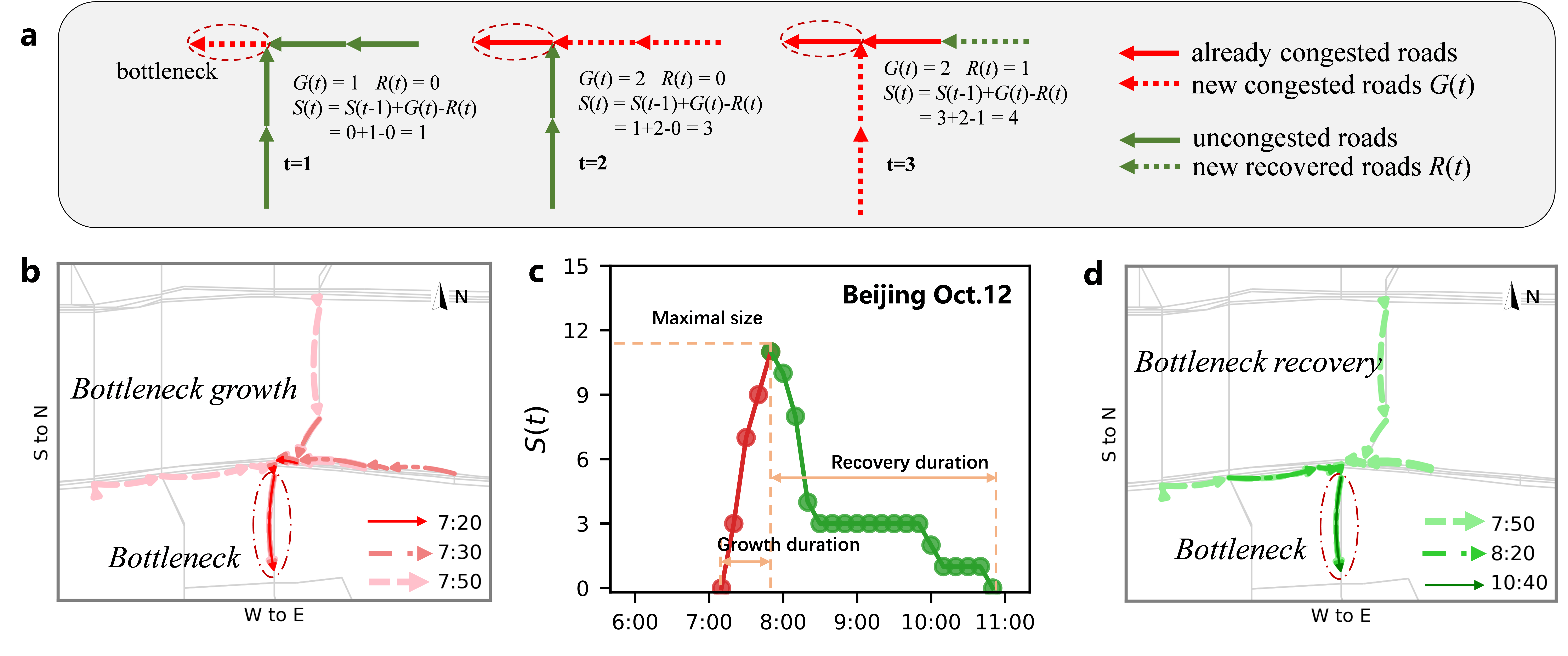 Fig. 1. Demonstration of jam propagation and dissipation from a typical bottleneck in traffic network. a Demonstration of congestion size S associated with a bottleneck in an illustrated network. b Several snapshots of the congested road segments during growth stage at 7:20, 7:30, and 7:50 for a specific but typical bottleneck on Monday, October 12, 2015, in Beijing. The arrows of the links are the directions of traffic flow. c The size S changes over time. This congestion component lasted for more than 3 hours after its bottleneck emerged. d Several snapshots of the congested road segments during the recovery stage at 7:50, 8:20, and 10:40.