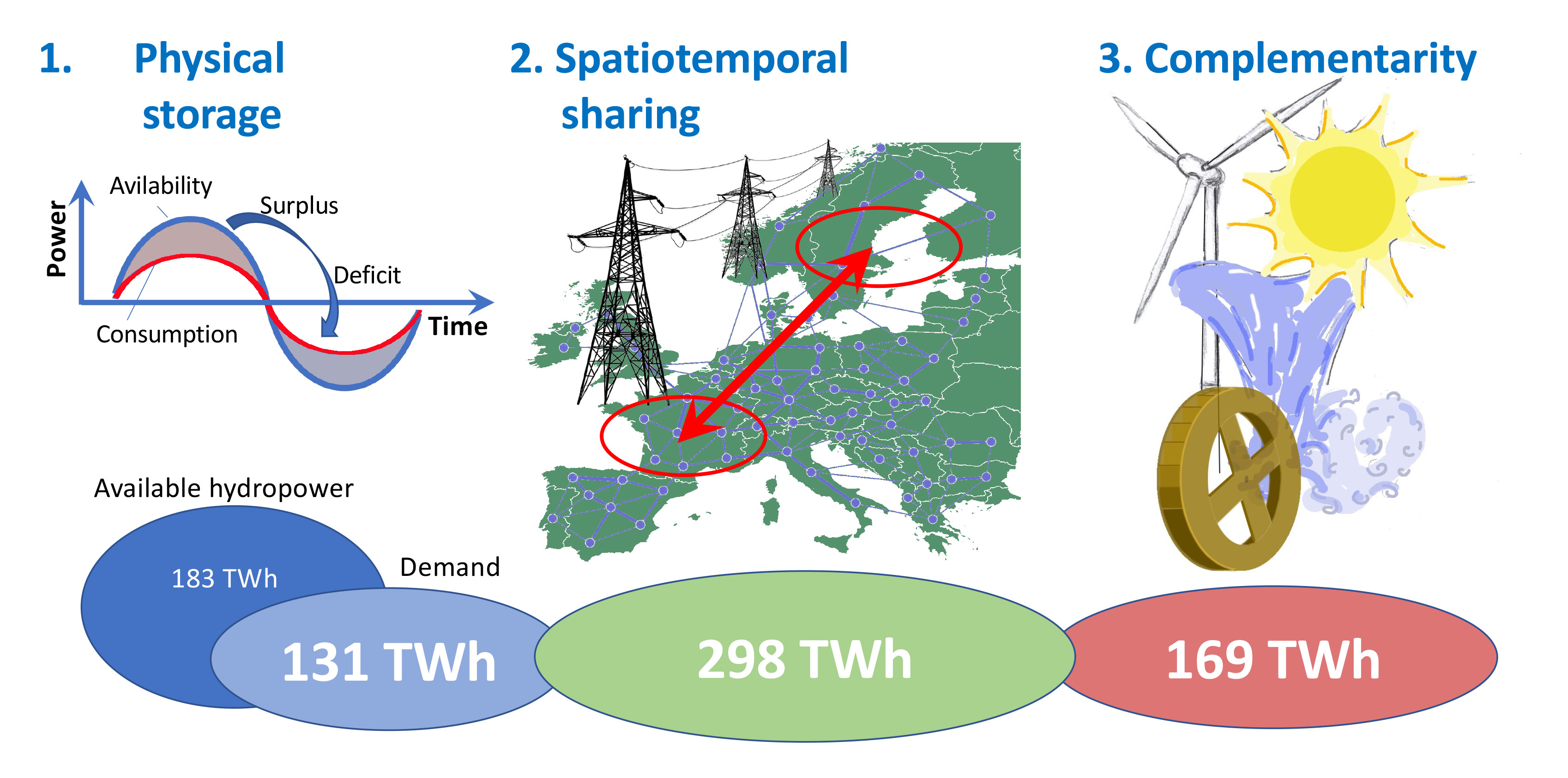 We found that the existing hydropower reservoirs in Europe provide sufficient energy storage to overcome energy drought periods, but only if the renewable electricity production is complemented with appropriate shares of wind and solar power and if the production-demand system is managed at the continental scale. Spatiotemporal management of solar, wind and hydropower can induce a virtual energy storage gain (VESG) that is several times greater than that available in existing hydropower reservoirs (Figure 1). In this analysis, we assumed that the long-term average production capacity exactly matched the long-term demand, implying that no potential renewable energy production is curtailed. In practice, in renewable energy production, a common approach is to install a higher power capacity than needed from a long-term average point of view; hence, energy curtailment is a common phenomenon. The finding that solar wind and hydropower can, in principle, provide enough energy for all at all times indicates a possible scenario for the energy transition towards a fully renewable electricity system.