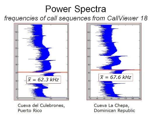 The most striking difference we found between traits in the two populations was in the frequency of the CF component of the echolocation calls. Call frequencies of Hispaniolan bats averaged 67.5 kHz while Puerto Rican bat calls averaged 62.4 kHz.Little variance was observed within each population, as the frequency is tied to an adaptation in the inner ear tuned for the precise frequency of the CF. While Hispaniolan females had significantly higher CF frequencies than males; no sexual difference was found in the Puerto Rican populations. We found physical correlates for these differences, but although Hispaniolan bats were smaller on average, the ranges of body weights and forearm lengths between the islands overlapped broadly. The larger body size of the Puerto Rican populations was insufficient to explain the difference in call frequency.