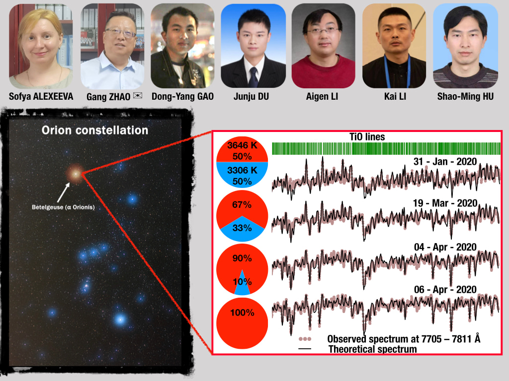 - Professor Gang ZHAO suggested me to study the possible physical cause behind this phenomenon with our advantage of spectroscopic analysis. We had many discussions about what a complex star Betelgeuse is. Many physical processes are involved there, such as, huge convective flows, pulsations, magnetic field, material ejection, and dust condensation. Some of them are not well-understood and cannot be considered in theoretical models.