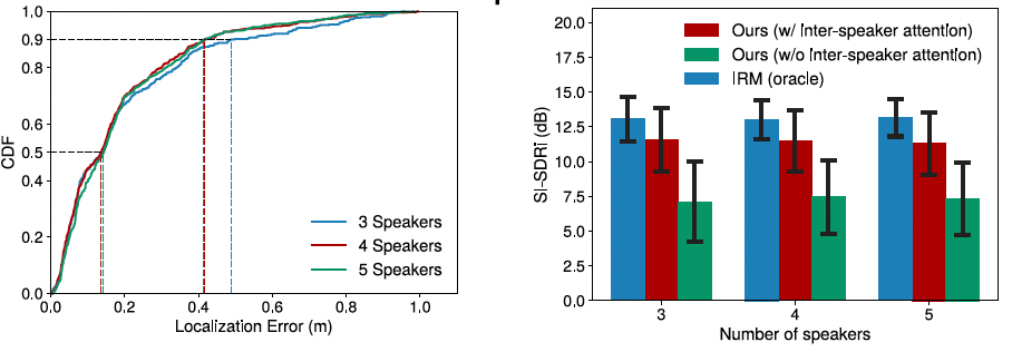 We assess our system’s performance when the microphone arrays are deployed in previously unseen cluttered environments. Our evaluation used the environments that were unseen during training and included offices, living rooms, laboratories. To obtain the ground-truth signals, we used loudspeakers to play back speech signals from different locations in the room at heights ranging from 90 to 160 cm. Our evaluate shows that the median localization error across all the tested scenarios was 15 cm and that the 90 percentile error was 49–50cm for 3–5 concurrent speakers. Further the signal quality improvement is noticeable demonstrating successful speech separation in real-world reverberant environments.