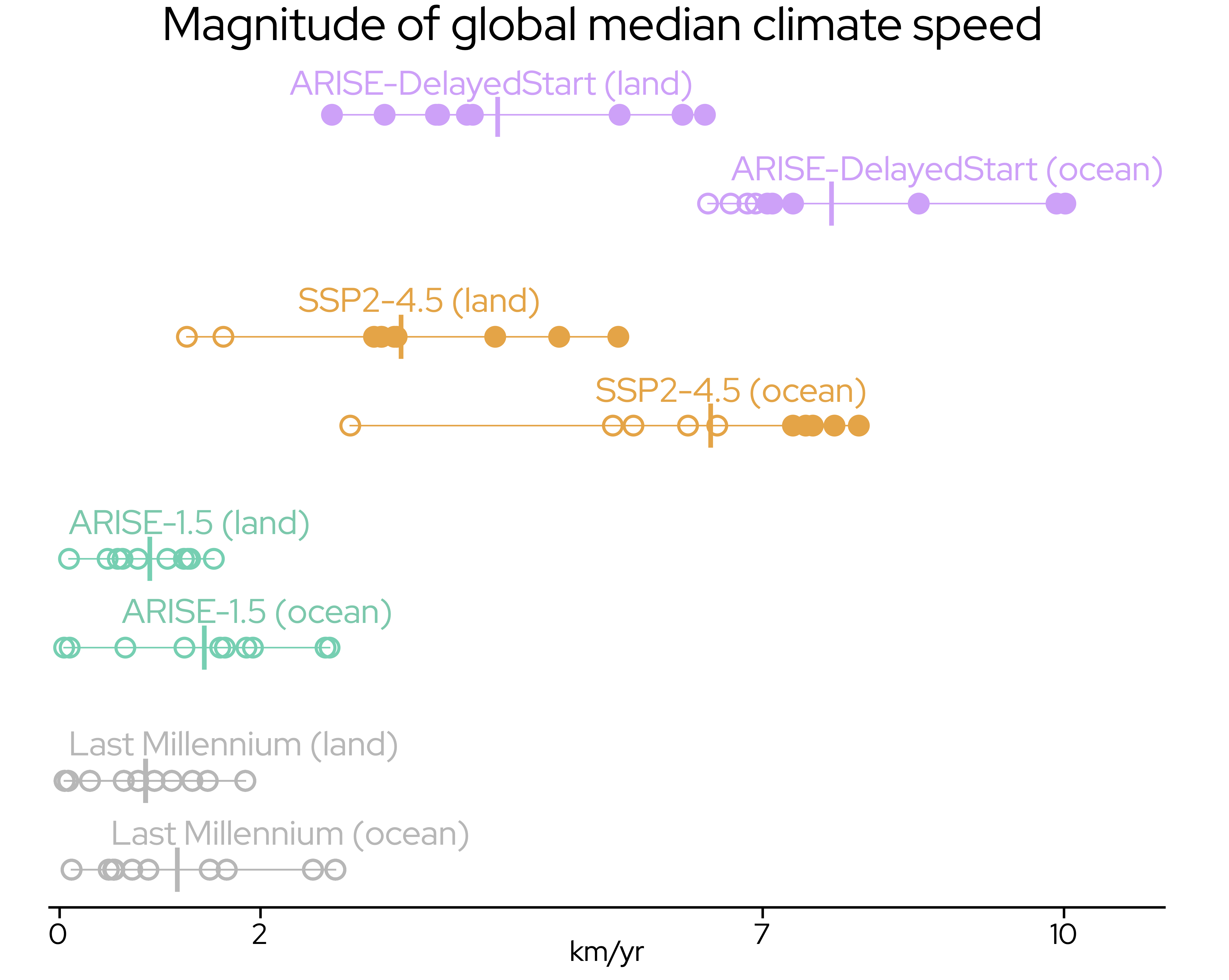 Each ARISE scenario contains ten different ensemble member simulations that depict equally-plausible representations of climate variability. Analyzing these members helps further illustrate the scale of the global response to the ARISE-DelayedStart intervention (Figure 3). On the planetary scale, ARISE-1.5 and the Last Millennium are statistically indistinguishable from each other; however, there is no overlap between these simulations and ARISE-DelayedStart! Even the ensemble member with the smallest speeds in ARISE-DelayedStart is beyond the member with the maximum speeds in either ARISE-1.5 or the Last Millennium.