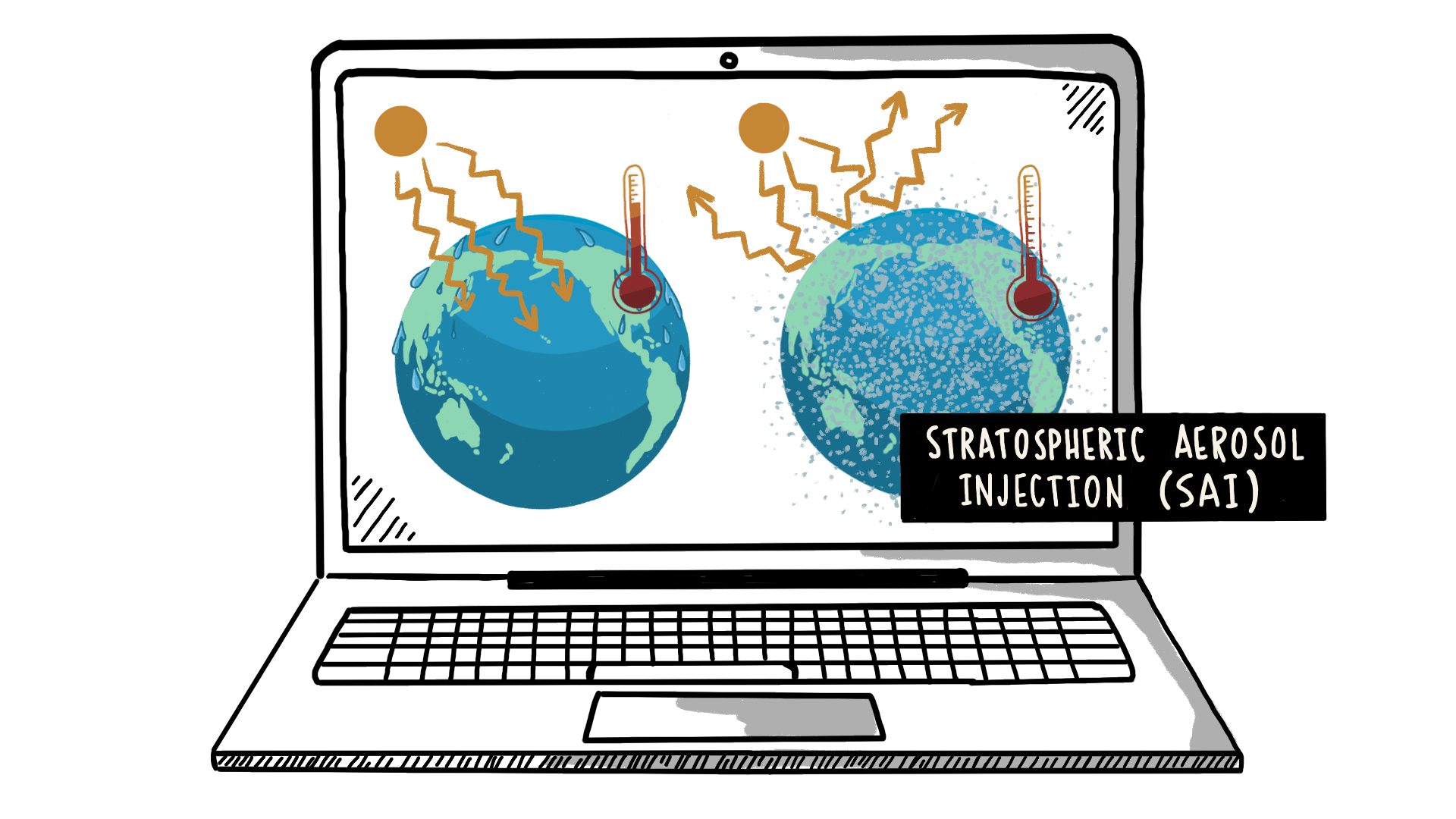 Figure 1: Stratospheric aerosol injection (SAI) is a hypothetical method to cool the planet by placing reflective particles into the upper atmosphere. [Graphic from “Introduction to Climate Intervention” video, designed by Heartwood Visuals in project led by Daniel Hueholt, Elizabeth Barnes, James Hurrell, and Patrick Keys.]