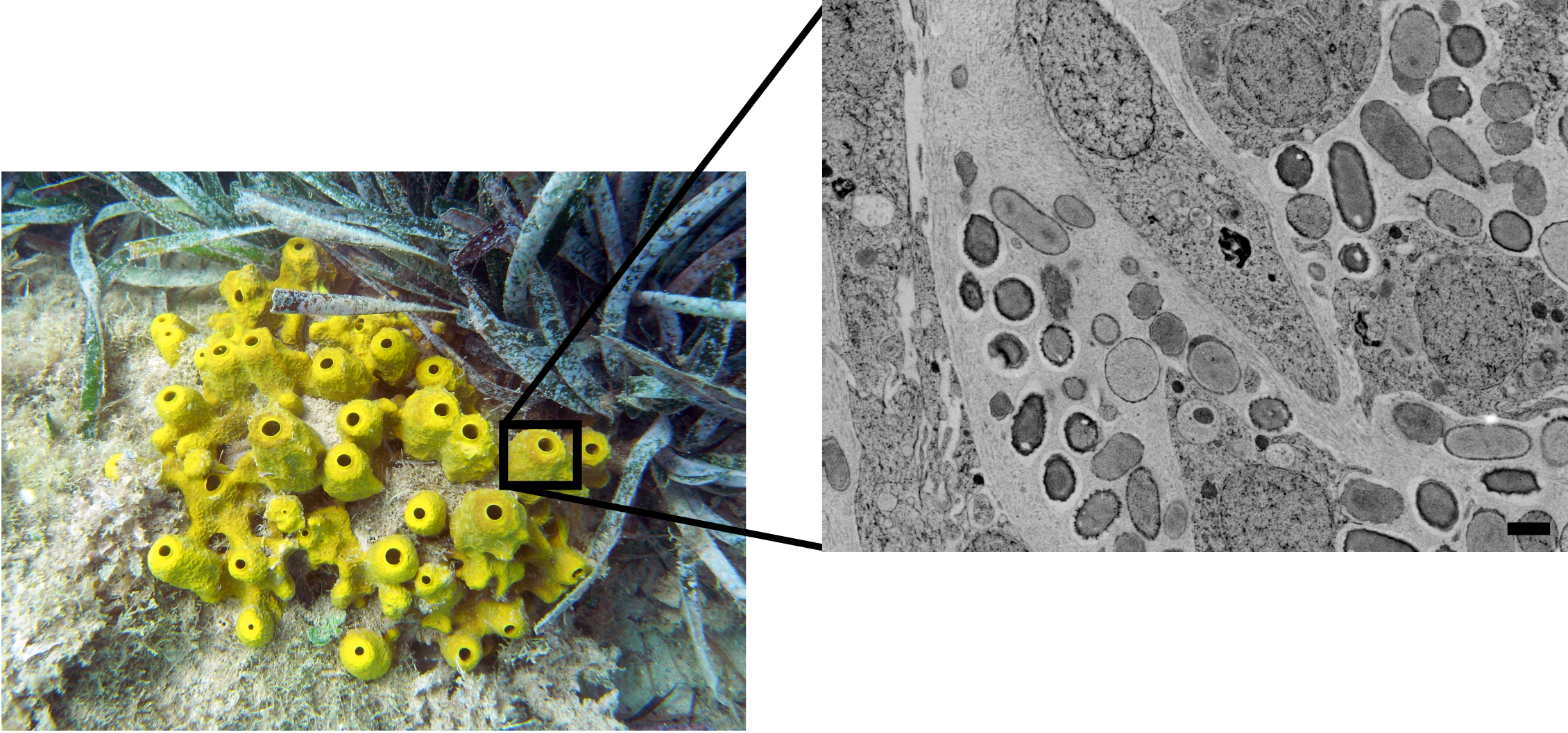 The Mediterranean sponge Aplysina aerophoba. Typical macroscopic (left)- and microscopic (right) structure of the studied animal. Bigger cells are amoeboid sponge cells with nuclei; smaller cells are symbiont bacteria living in close contact. Scale bar 1 µm. Credit: Left image; Manel Bolivar; the image was corrected to remove blue cast.