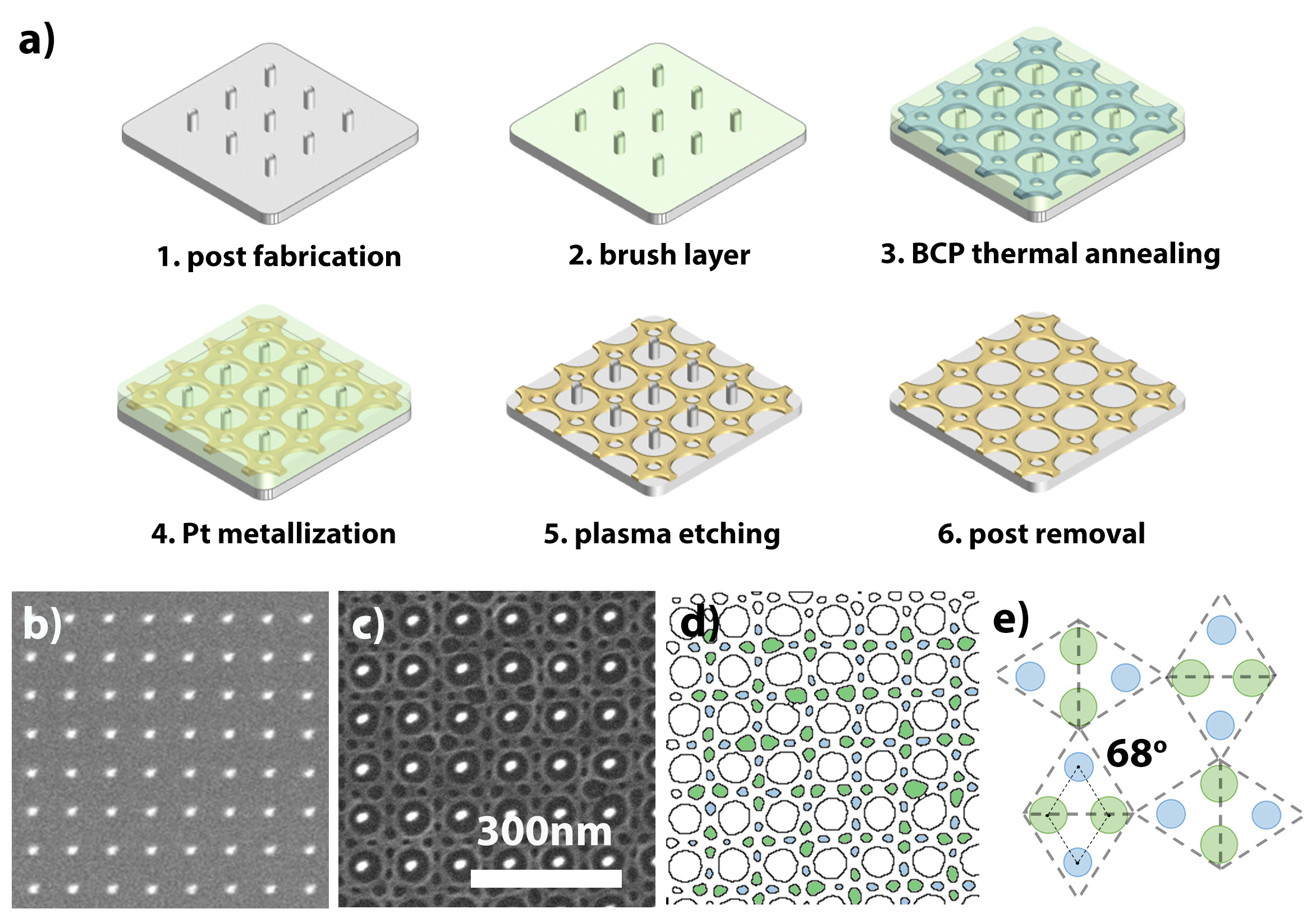 Figure 1 | a, fabrication procedure of block copolymer in epitaxial template. b, square symmetric post array template. c, block copolymer in post array template, exhibiting broken symmetry and supperlattice structure; d, highlights of the two-fold symmetric block copolymer domains; e, geometric illustration of the superlattice structure.
