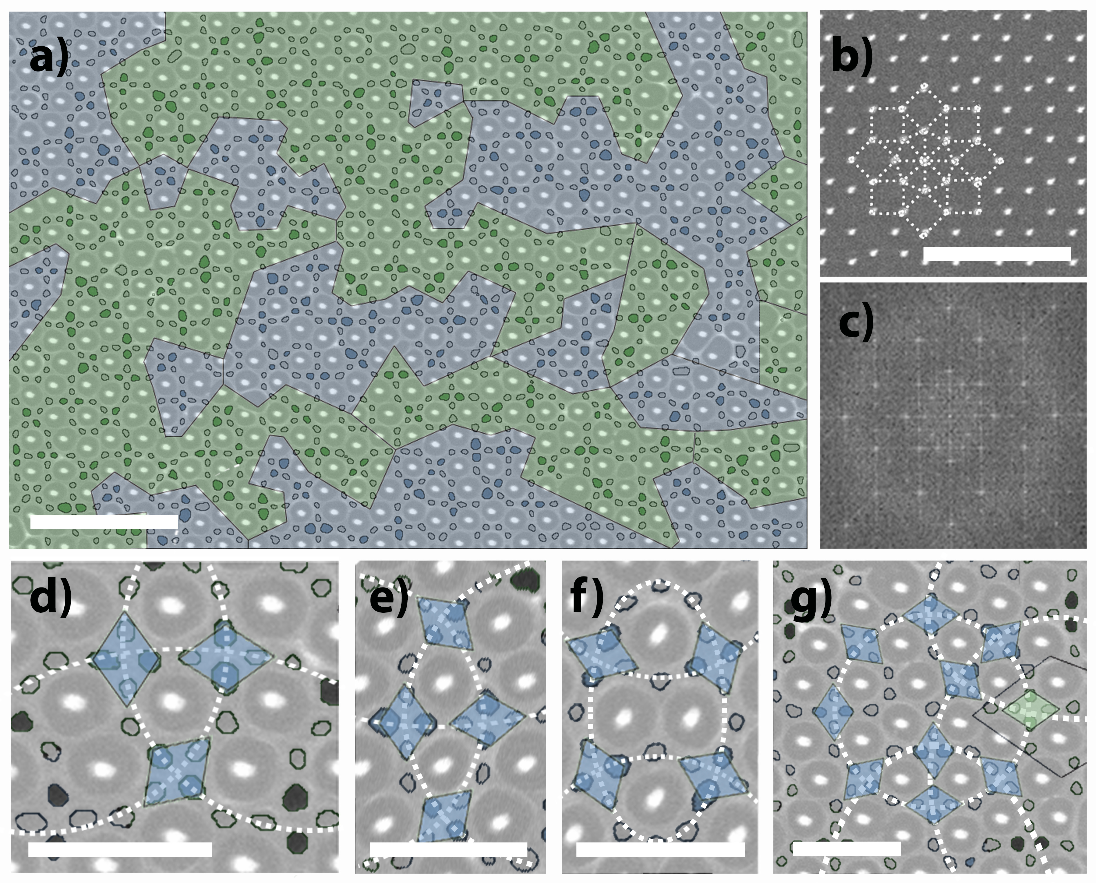 Figure 2 | a, block copolymer in octagonal quasicrystalline template (Ammann-Beenker tilings). b, post array without block copolymers; the dashed lines indicate the local 8-fold rotational symmetry, composed of square and triangular geometries. c, Fast Fourier Transformation of the original image shown in a. d–g, block copolymer domain contours, showing different ways of interaction between neighboring domains.