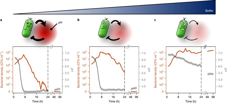 Many organisms can modify habitats for their own benefit, but some may also do so in non-beneficial ways. Here, Ratzke et al. report an extreme example in soil bacteria in which modification of environmental pH at high population densities leads to population extinction