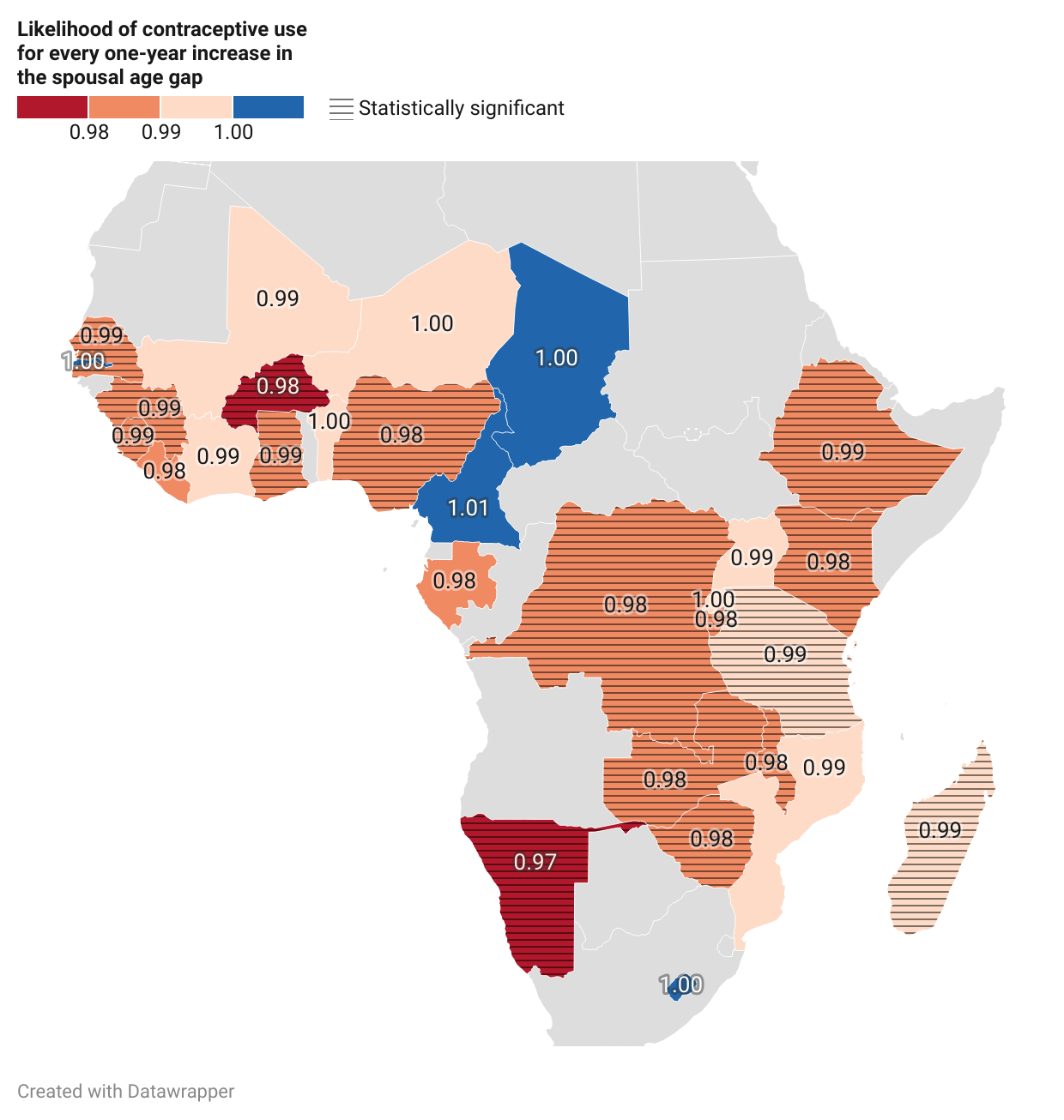 However, the results vary across countries when it comes to the relationship between the age difference of spouses and contraceptive use. In countries where a larger age gap does have a negative association, there are differences in location, how common contraceptive use is, and the average age difference between spouses. This highlights a need for further research to understand how cultural beliefs, gender roles, and broader social factors might affect the relationship between spousal age gaps and contraceptive use.