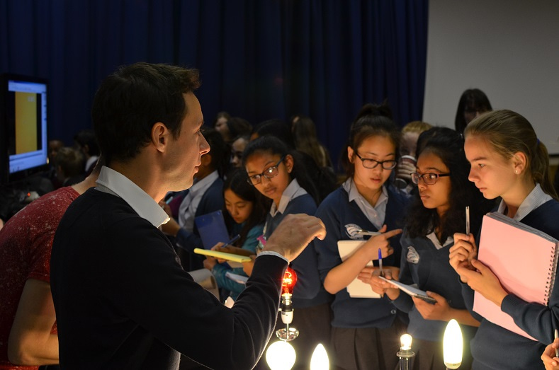 Of course, 240 11- to 13-year-olds won’t sit in lectures for a whole day, and science isn’t that much about listening to other people telling facts anyway. The lectures were therefore embedded in two interactive sessions where the students could get more involved in a range of demonstrations: changing the colour of an LED to one of their choice, learning about spectroscopy and its uses for astronomy, getting their brain imaged while doing some maths, and playing with reflection, diffraction and polarization (among other things). Here, they could also speak to active scientist and — unknown to them — a few of our editors who revisited their own research days by helping out on a station. The students also found out that they could get more involved with science themselves in one of the many citizen science projects at UCL.