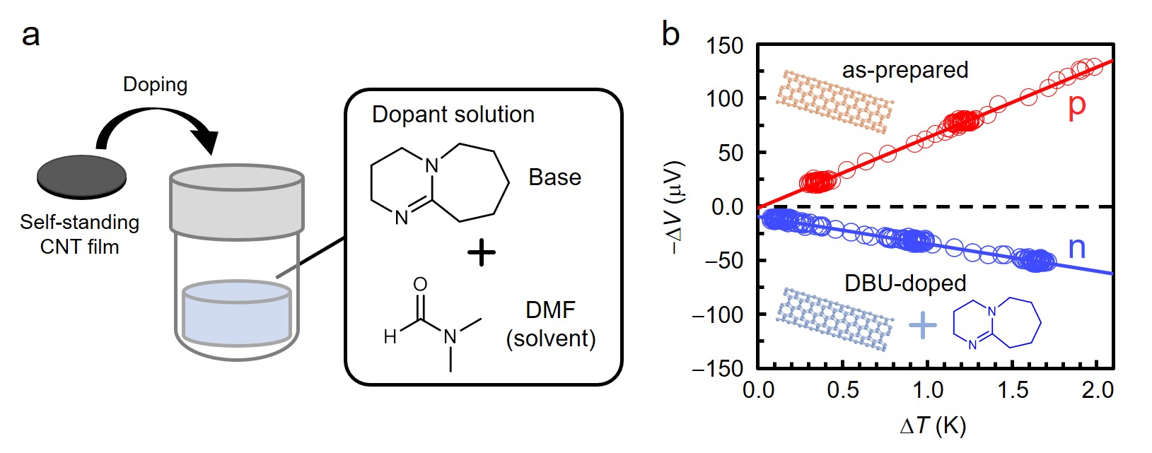 To overcome this limitation, the K. Ishida laboratory of Kobe University (Japan) and the Nanofilm Device group at National Institute of Advanced Industrial Science and Technology (Japan) collaboratively developed reducing agents for developing n-type CNTs with outstanding thermal stability in air. These groups have investigated doping technology for nanoscale carbon materials and conducting polymers, developed characterization technology for quantifying the doping levels, and applied the developed materials to molecular thermoelectric generators1–5.
