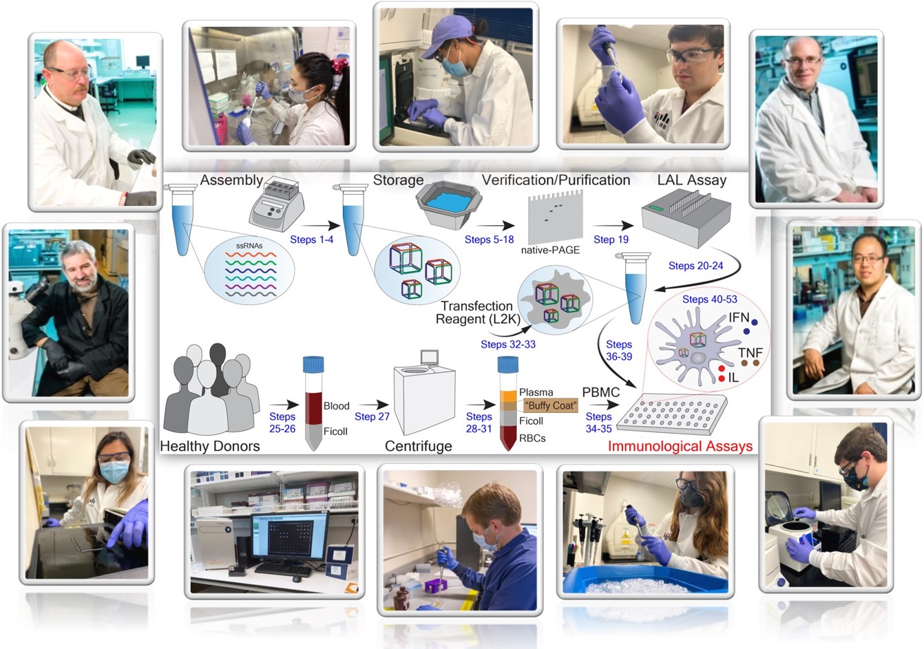 We are excited about this protocol because it is flexible and allows testing biomarkers beyond the interferon response. For example, if desired, a set of pro-inflammatory cytokines (TNFα, IL-1β, IL-6, IL-8), known as markers of pyrogenic responses, or markers of T-cell activation (IL-2, IFNγ) can also be reproducibly measured. If desired, PBMCs could be replaced with relevant cell lines or other types of primary cells. Moreover, we proposed a set of NANPs and conditions that could be used as controls specific to nucleic acid nanotechnology, as well as reagents and instructions for mechanistic studies to uncover the mechanisms of nanoparticle immune recognition. We hope that other researchers find it as helpful as our teams did.