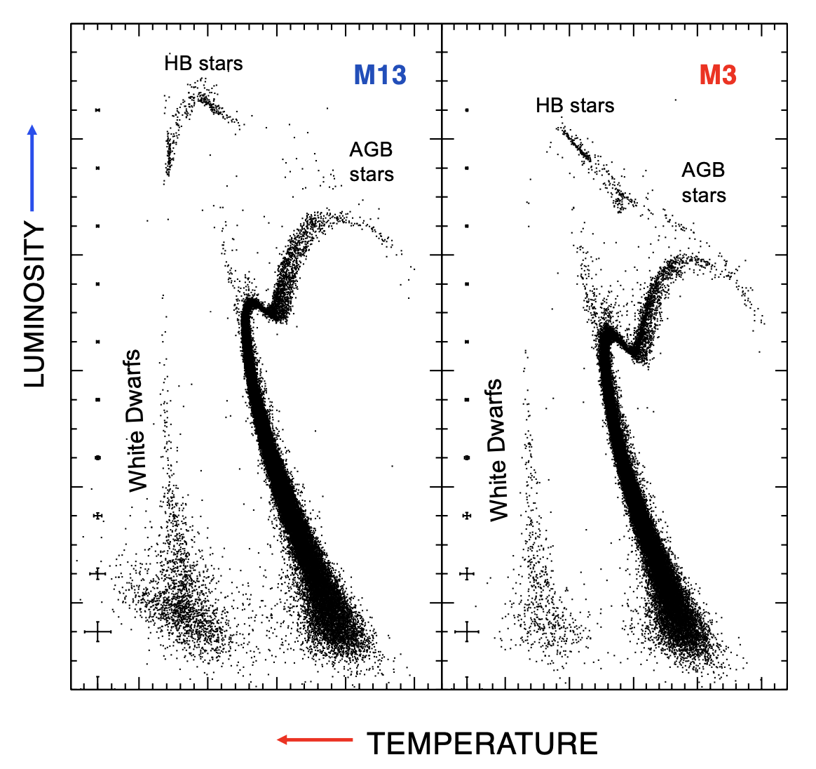 The story of this discovery starts in September 2019, when Jianxing Chen, the first author of the paper, arrived in Italy from China to start his PhD course in Astrophysics at Bologna University. Jianxing was selected and granted by the China Scholarship Council (CSC) to attend its PhD in Italy. He was interested in studying the physics of White Dwarfs, and I was happy to propose him a thesis on the properties of these objects in old star clusters. As starting point, I proposed to focus on a simple but intriguing case: the comparison of the WD observational properties in two well-known Galactic globular clusters (named M3 and M13) that are so similar in many aspects to be considered as a sort of “twins”. However, as in the human case, twins are similar but not identical, and can show a few specific differences. The most relevant and known difference in the case of M3 and M13 is the morphology of their Horizontal Branch (HB). This is the evolutionary phase during which stars produce energy by the thermonuclear fusion of Helium in their core. The distribution of stars on the Horizontal Branch depends on the mass of the envelope surrounding the stellar core (or, equivalently, on the total stellar mass, since the core has the same mass in all the stars). In turn, this sets the stellar surface temperature, because thin envelopes imply high surface temperatures (hence, blue star), while large envelopes mean relatively low surface temperatures (thus, stars with redder colours). The colour-magnitude diagrams (CMDs) of M3 and M13 clearly show that these twins have different Horizontal Branch morphologies: the HB of M13 hosts many blue stars, with higher temperature and lower mass than M3, while in M3 the distribution is peaked at much lower temperatures (redder colours), which indicate larger stellar masses. Because White Dwarfs are the latest stage before death, their properties depend on what happened earlier in their evolution, and M3 and M13 thus represent a perfect natural laboratory to test how fast White Dwarfs generated by different stellar populations cool down in time.
