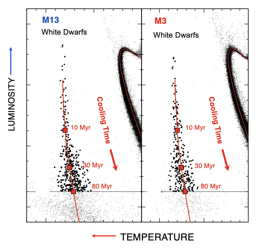 FIGURE 2 - Direct comparison of the WD populations in M13 and M3 in the Temperature-Luminosity diagram. The tracks traced by a cooling WD is marked by the red line. The cooling direction, i.e. the direction that each WD follows as a function of time is indicated by the red arrow: a few time-tags at 10, 30 and 80 million years, are also marked with red squares.