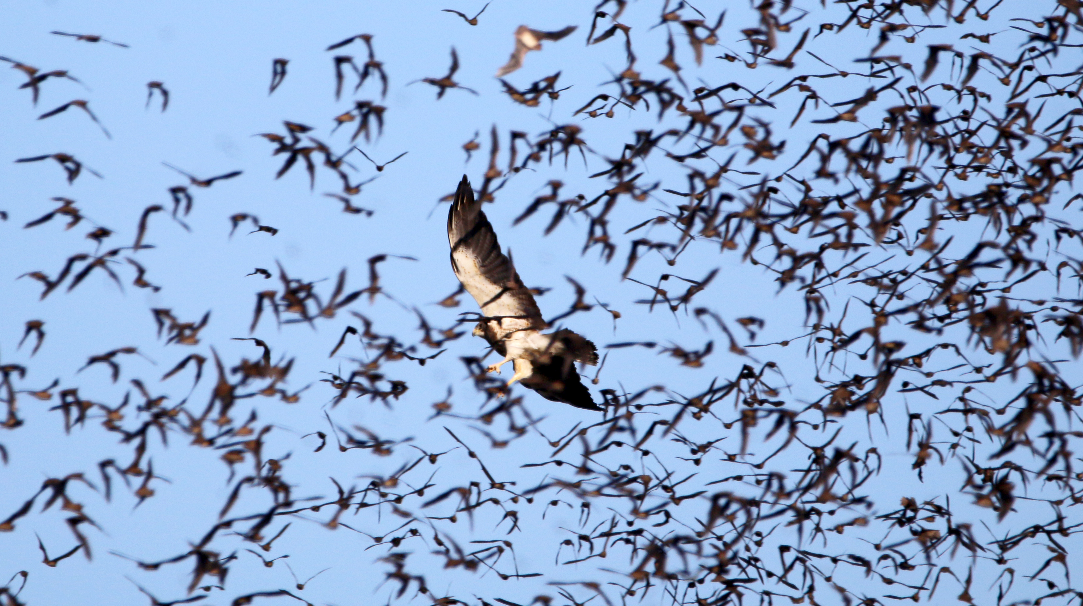 Figure 1. Swainson’s hawk hunting Mexican Free-tailed bats. This photo was taken at the study site in New Mexico and provides a snap-shot of the sensory challenge faced by a predator attacking the swarm.