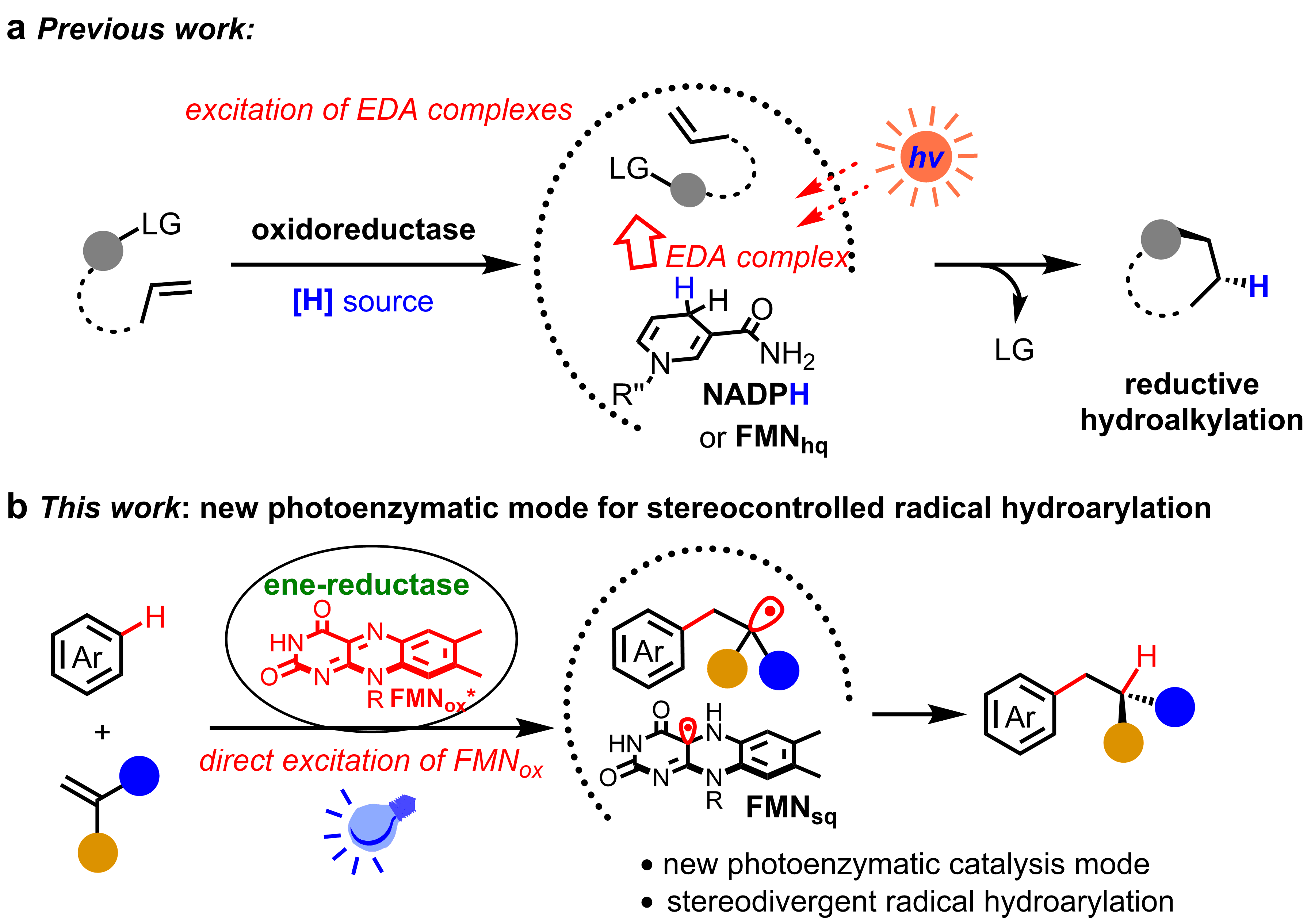Fig. 1. An unprecedented photoenzymatic hydroarylation. a, Previous work: Reported visible-light-driven unnatural biocatalysis relies on the excitation of EDA complexes accessing to reductive biotransformations. b, This work: Direct visible-light-excitation of FMN-dependent ene-reductase enables an unnatural redox-neutral hydroarylation of alkenes with arenes. FAD(ox), (oxidation form of) flavin adenine dinucleotide; FMN(ox/hq/sq), (oxidation/hydroquinone/semiquinone form of) flavin mononucleotide; NADPH, reduced nicotinamide adenine dinucleotide phosphate; EDA, electron donor-acceptor.