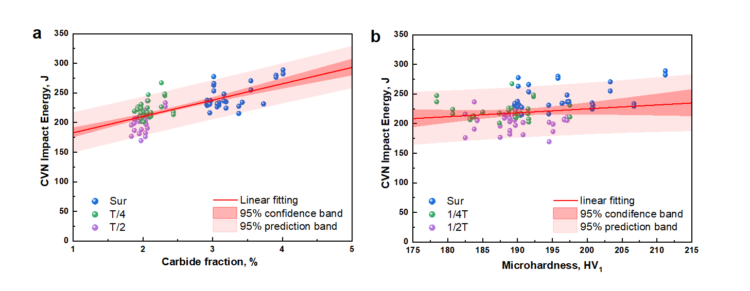 Carbides, as the primary reinforcing phase in low-alloy steels, has a significant impact on material properties. The carbide content and size were then statistically analyzed and carbide experienced partial coarsening and dissolution during aging, while the carbide fraction other than micro-hardness was found linearly correlated with the impact energy, as shown in Fig. 3.