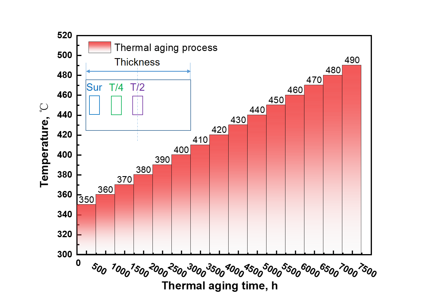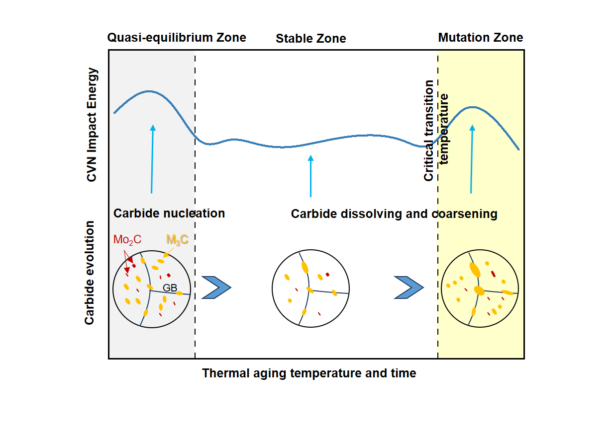 Guided by an assumption we made that the thermal aging-induced material degradation is under a temperature and time-dependent cumulative effect of microstructural evolution, we proposed a thermal aging restructuring scheme by step-up aging the steel from 350°C (design temperature) to 490°C with a total duration of 7500 hours, as shown in Fig. 1. Samples in varied thickness of the steel were characterized in terms of carbides evolution and Charpy impact toughness at 20°C.