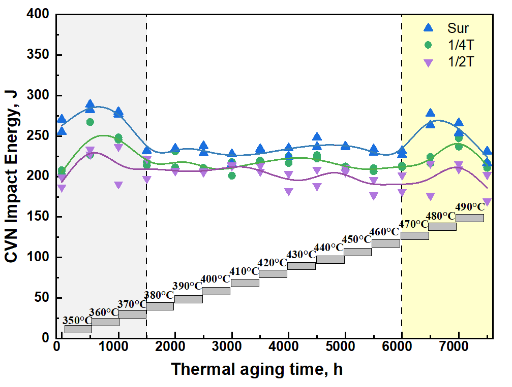 The evolution of impact energy versus aging time showed a bathtub curve with two distinct peaks across three regions in Fig. 2: the quasi-equilibrium zone in light grey, the stable zone in white, and the mutation zone in light yellow. The mutation in suddenly rising impact energy values indicates that 470°C is probably the temperature threshold that transforms the aging mechanism, which is the first time a verified temperature range for accelerated thermal aging of low alloy steel has been established based on testing. The findings reveal that, to ensure a consistent thermal aging mechanism with actual service circumstance, it is necessary to ensure the accelerated testing temperature is below 470°C.