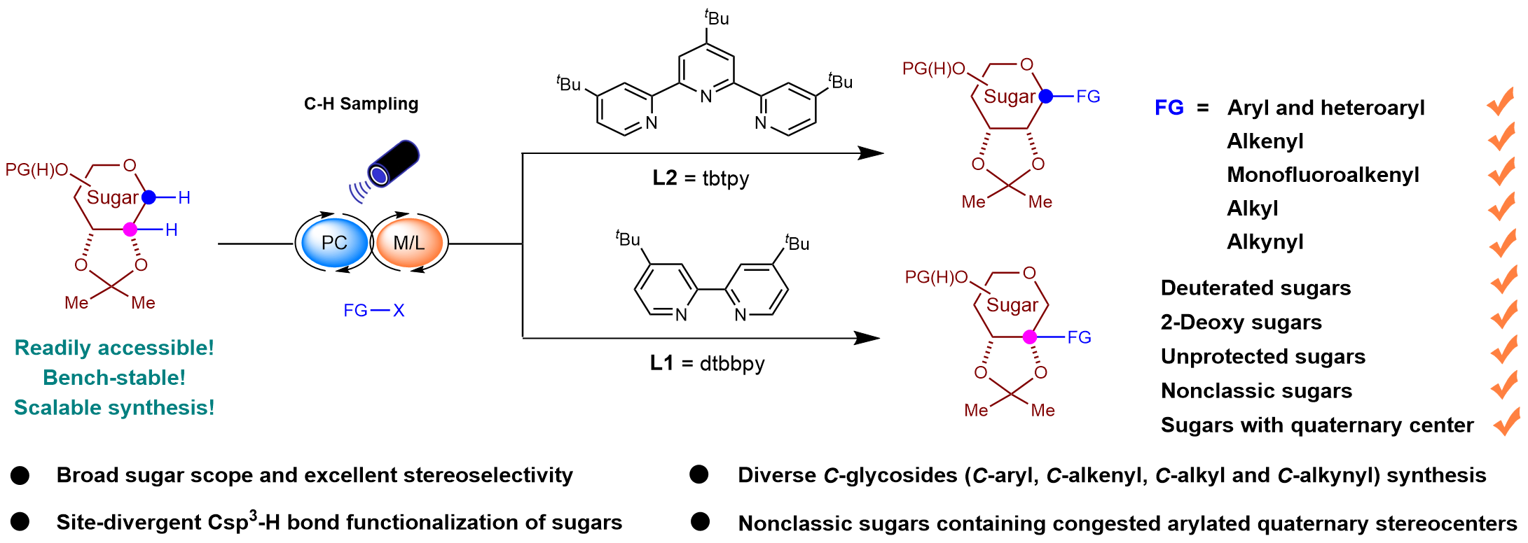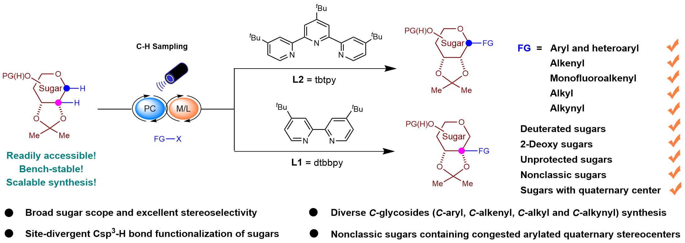 In 2023, our research team successfully achieved the enantioselective functionalization of Csp³-H bonds in oxyheterocycles using a photoinduced hydrogen atom transfer (HAT)/nickel co-catalytic strategy (J. Am. Chem. Soc. 2023, 145, 5231-5241). In this work, the Csp³-H bonds of oxyheterocycles with multiple chiral centers were subjected to stereoselective and site-selective functionalization through the manipulation of ligand configurations. Based on these findings, we hypothesized that a photo-HAT strategy could be employed to activate the C(sp3)-H bond in deoxyglycosides, followed by nickel-catalyzed modulation of site- and stereoselective glycosidic functionalization. Current glycosyl donors typically introduce reactive functional groups at position 1, thus enhancing their reactivity but also complicating their preparation. The synthesis of 1-deoxyglycosides involves the conversion of the C-O bond at position 1 into a C-H bond, a modification that significantly improves the stability of these molecules, allowing for prolonged storage under ambient conditions and enabling large-scale preparation in just two steps.