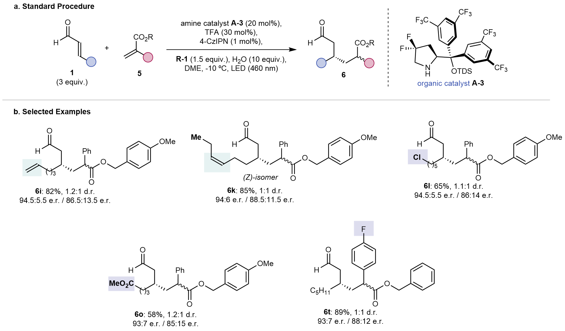 We set out to explore the idea using our difluorinated pyrrolidine catalyst, which is amenable to radical asymmetric iminium ion catalysis7, an external photocatalyst and a 1,4-dihydropyridine as sacrificial reductant. We were pleased to see the β-cyanoaldehyde product formed with exclusive 1,4-chemoselectivity and good enantioselectivity over a variety of aliphatic enals bearing diverse functional groups, such as alkyne and phthalimide. More complex enals, including natural product derived scaffolds, could also be transformed, without altering the pre-installed alkene and ketone functionalities. Furthermore, stereoinduction of the cyanation is dictated by the aminocatalyst and not influenced by the pre-existing stereocenters in the starting materials. The cyanoaldehyde products are of great synthetic value, as shown in the short preparation of an unnatural chiral γ-amino acid after redox manipulation steps.