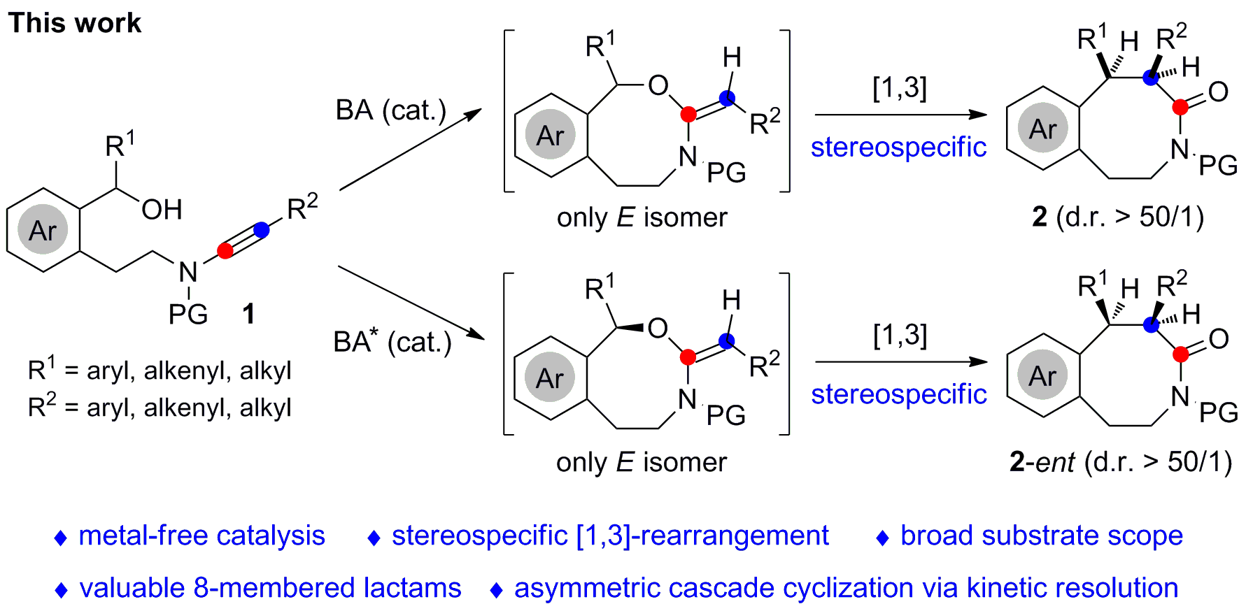 Our group is interested in the development of ynamide chemistry for heterocycle synthesis. Based on our recent study on the yttrium-catalyzed tandem intramolecular hydroalkoxylation/[3,3]-rearrangement, for the synthesis of various valuable medium and large ring lactams (Angew. Chem. Int. Ed. 2017, 56, 4015-4019), we wondered whether we could realize the relevant intramolecular hydroalkoxylation/ [1,3]-rearrangement reaction. Thus, we could construct another kind of eight-membered lactams (benzo[d]azocinones), which are important structural motifs found in many bioactive molecules and natural products. Moreover, we anticipated to control the diastereoselectivity and enantioselectivity of this tandem reaction.