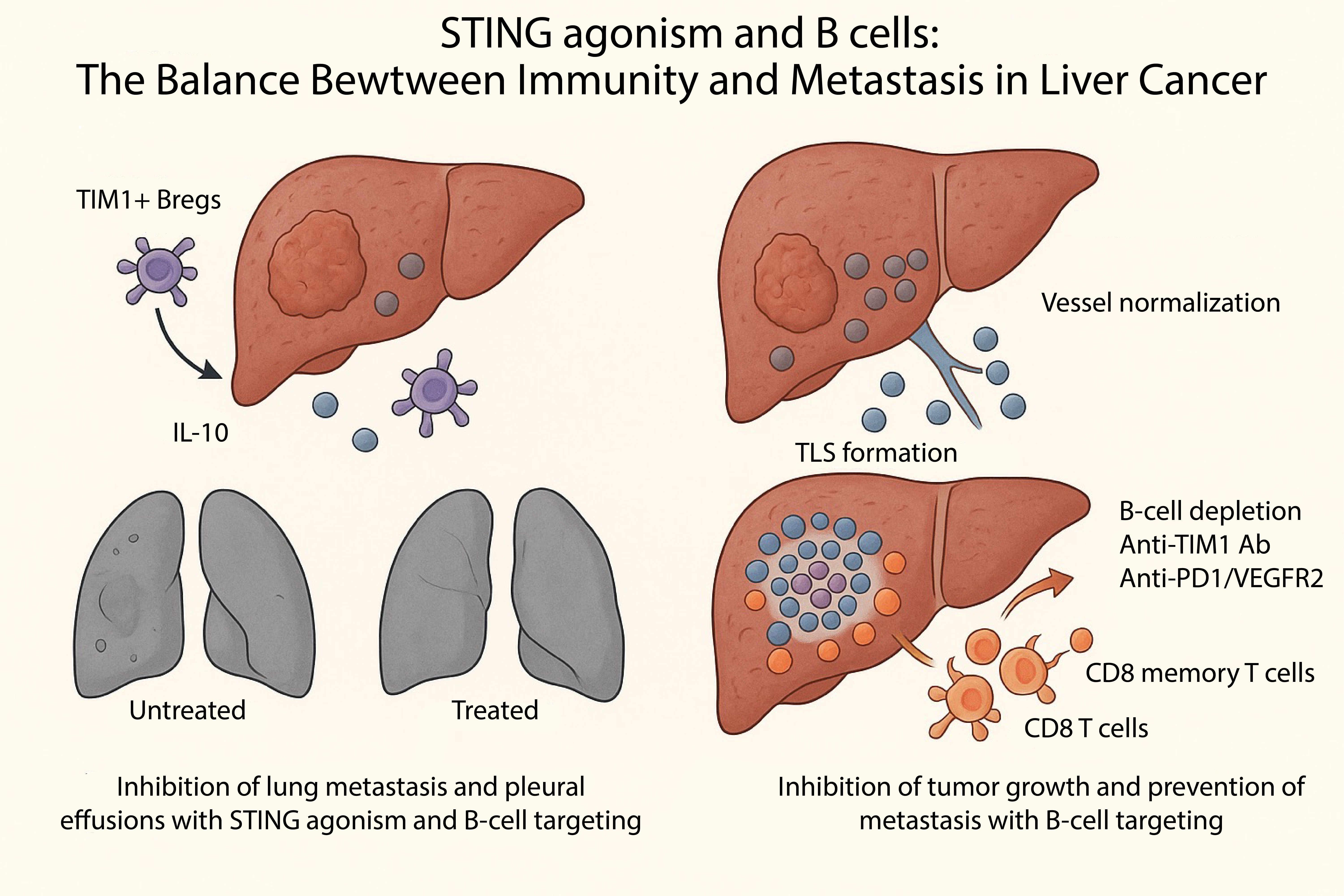 Immunotherapy can potently activate anti-cancer immunity, yet liver cancer often resists it. Our new research reveals one reason why: STING agonism or PD1/VEGFR2 blockade increases regulatory B cells that suppress T cells. Targeting these B cells can restore the immune balance and block metastasis.