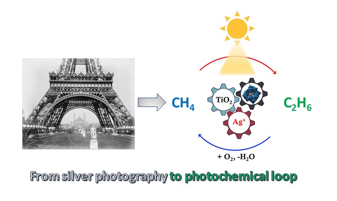 In order to reach quantitative conversion of methane to higher hydrocarbons under irradiation, we proposed with Dr Vitaly Ordomsky and other coauthors a concept of photochemical loop, which involves separation of the reaction and regeneration stages. In the reaction stage, methane under irradiation is stoichiometrically coupled to ethane with sliver being simultaneously reduced to the metallic state. In the regeneration stage, light re-oxidizes under air metallic silver back to the cationic state. The proposed cycling between cationic and metallic states with selective methane coupling can be reproducibly repeated over and over again over the developed photosensitive nanocomposites.