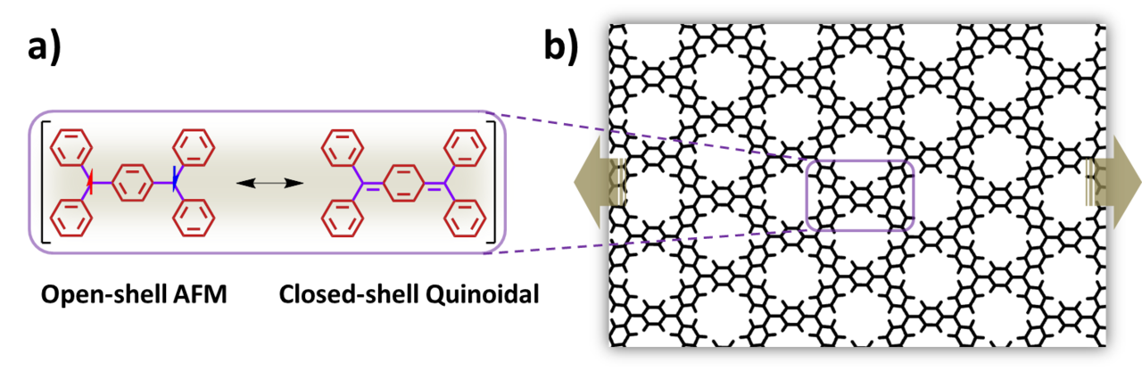 Fig. 3. a) Para-connected TAM dimers, such as the Thiele’s hydrocarbon, show two energetically close resonant configurations with very distinct magnetic and optical properties: namely the open-shell antiferromagnetic (AFM) and the closed-shell quinoidal. b) In our present work we show that by integrating such bi-radical units into 2D-CORFs allows for reversible switching between the two configurations via applied uniaxial strain.
