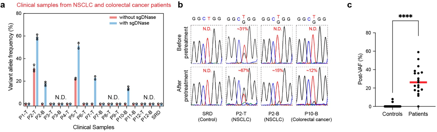 Fig. 4 | Detection of ultralow-abundance mutations in clinical biopsy samples with sgDNase pretreatment. a, sgDNase applied to sixteen cfDNA and genomic DNA samples from eight NSCLC patients (P1-P8), four colorectal cancer patients (P9-P12) and standard reference DNA (SRD). P, T and B in the sample name represent patient, tissue sample (genomic DNA) and blood sample (cfDNA) respectively. b, Comparison of Sanger sequencing chromatograms of the EGFR L858R mutation in gDNA (tissue) and cfDNA (blood) samples from an NSCLC patient and a colorectal cancer patient before and after sgDNase pretreatment. c, Summary of the post-VAFs of cancer patients and negative gDNA control after sgDNase pretreatment (measured by Sanger sequencing). P value = 1.4E-76, from two-tailed Welch’s unpaired t-tests.