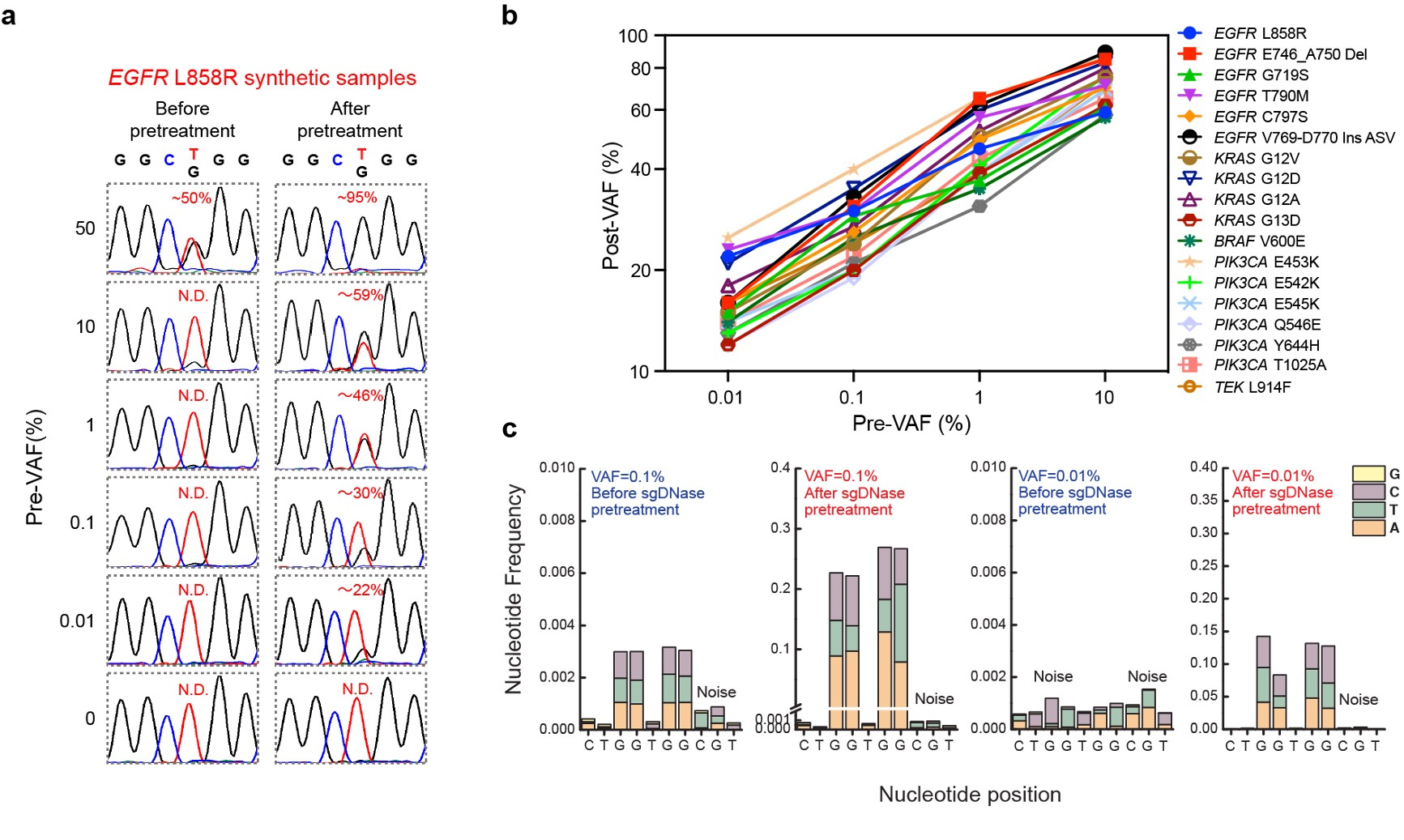 Fig. 2 | Enrichment of single and multiplex hotspot mutations by sgDNase pretreatment. a, Comparison of Sanger sequencing chromatograms of synthetic EGFR L858R samples with different pre-VAFs (0% - 50%) before and after sgDNase pretreatment. b, Post-VAFs (measured by Sanger sequencing) of 18 clinically relevant target mutations with pre-VAFs varying from 0.01% to 10% after single-plexed enrichment by sgDNase. c, Next-generation sequencing (NGS) measurement results of the abundance of KRAS G12G13 mutations in the sample with a pre-VAF at 0.01% before and after sgDNase pretreatment. Variant to noise plots derived from sequencing data are depicted.