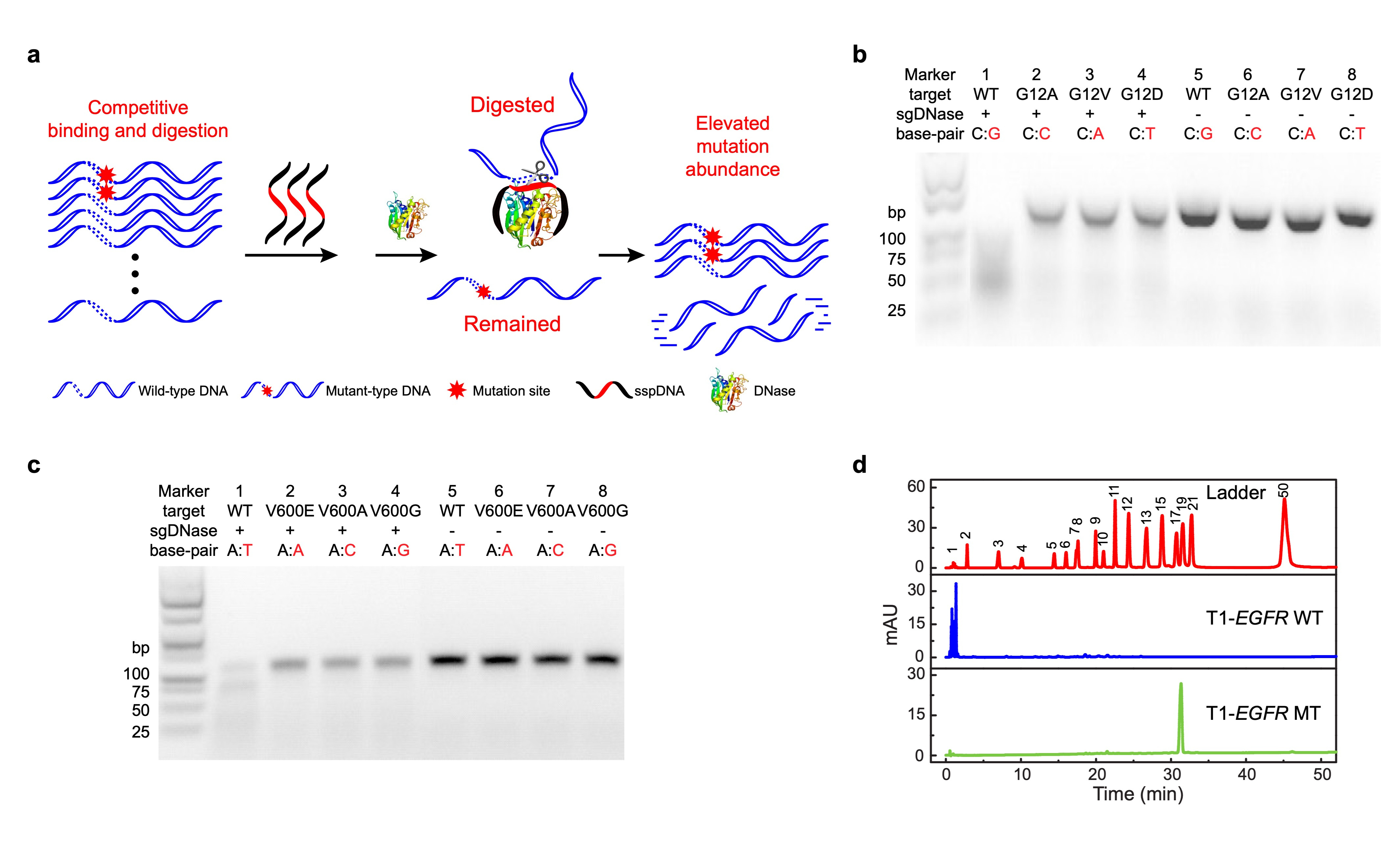 We first validated the sequence specificity of sgDNase by fluorescent probe method, high performance liquid chromatography analysis and gel electrophoresis analysis respectively. As shown in Figure 1b-d, under the guidance of sspDNA with a sequence fully complementary to the WT DNA sequence, sgDNase could rapidly digest WT DNA strands with high selectivity. In contrast, the majority of the mutant-type DNA strands (MT) were retained. Moreover, the results demonstrate the discrimination effect of sgDNase on different types of mismatches across various genes.