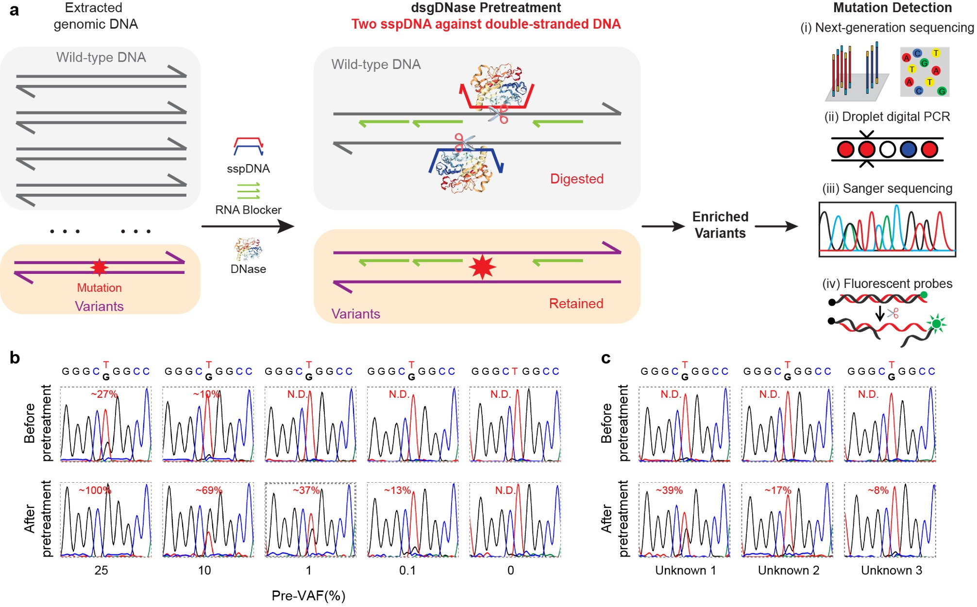 Fig. 3 | Direct pretreatment of genomic DNA by double sspDNA guided DNase (dsgDNase). a, Schematic illustration of direct enrichment of mutations in double-stranded genomic DNA by double phosphorothioated DNA guided deoxyribonuclease I (dsgDNase) system. b, Comparison of the Sanger sequencing results of genomic DNA with EGFR L858R mutation at different pre-VAFs (0% - 25%) before and after dsgDNase pretreatment. c, Sanger sequencing chromatograms of three unknown genomic DNA samples with EGFR L858R mutation before and after dsgDNase pretreatment.
