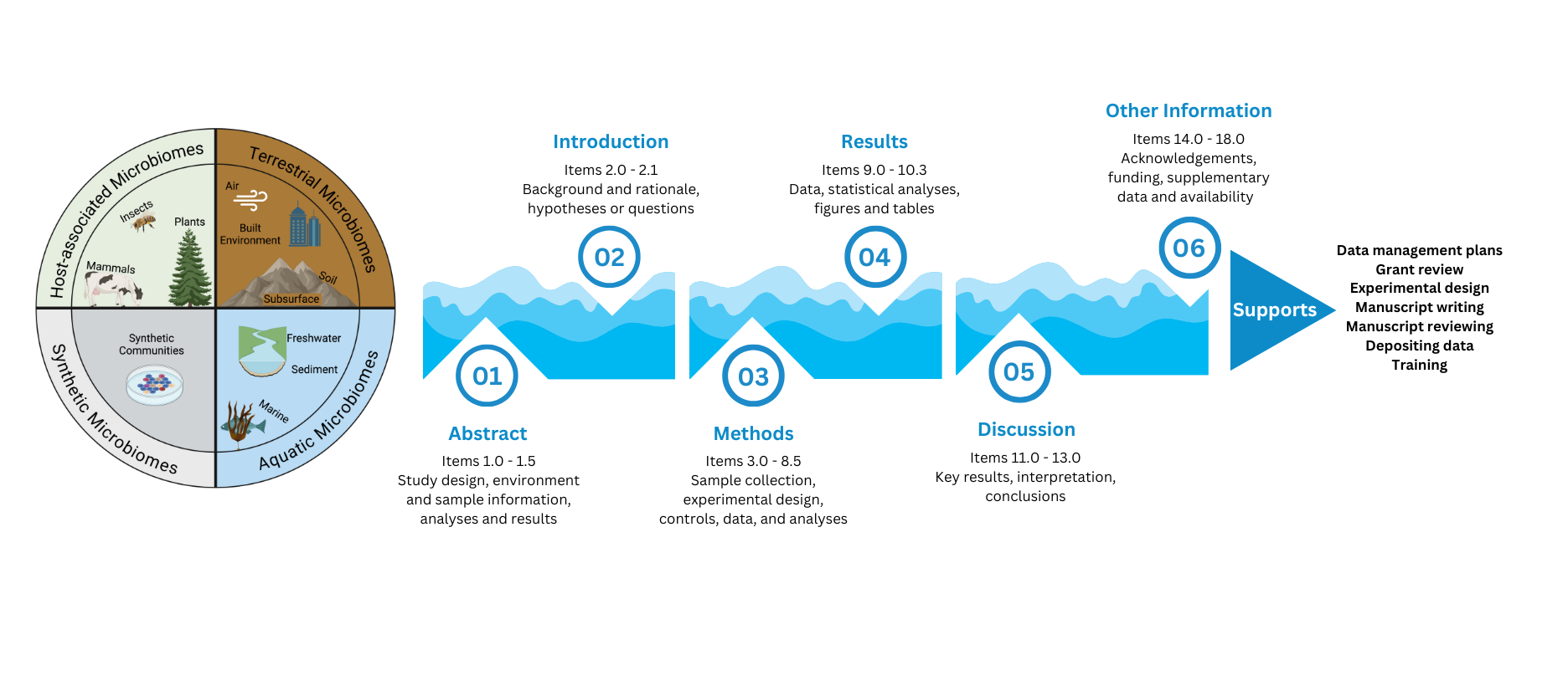 The STREAMS guidelines follow the structure of a scientific manuscript and support the evaluation of publications relating to environmental, non-human host-associated, and synthetic microbiomes. The guidelines are also envisioned to help with data management plans, grant writing & reviewing, manuscript reviews, experimental design, data repository depositions, and education & training.