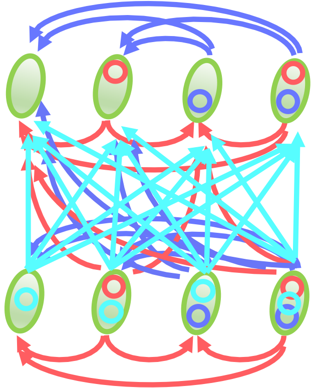 Fig. 1 the plasmid mobility network of a single species transferring three plasmids. The red, blue and cyan circles stand for the plasmids. The arrows represent the plasmid transfer from donors to recipients.