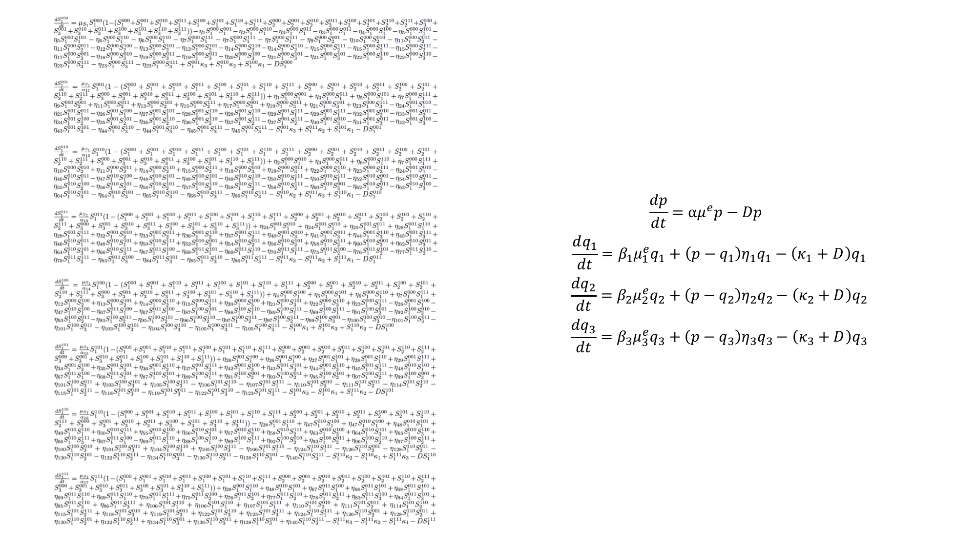 Fig.2 the equations of the traditional (left) and the new (right) framework to describe the community dynamics of one species transferring three plasmids.