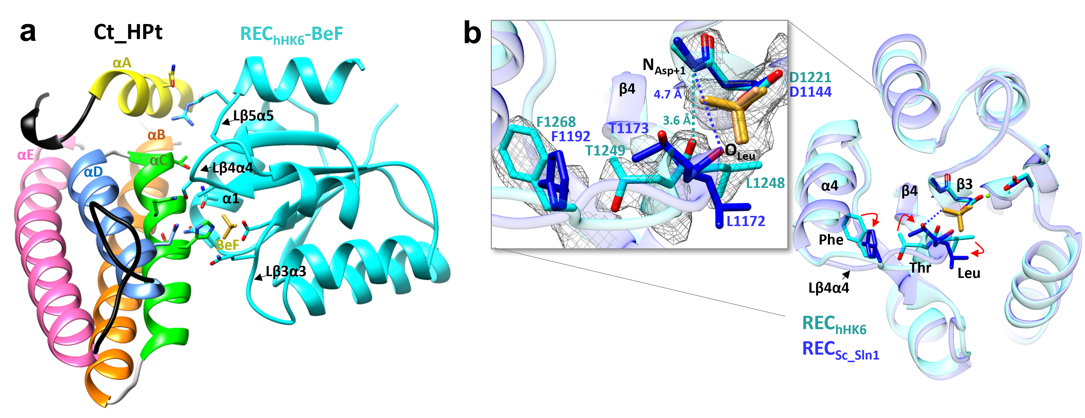 Fig. 2. Complex structure of REChHK6 bound to Ct_HPt. a) Complex containing phosphomimetic and stabilized by interacting residues. b) Zoom in on the active center of the complex for REC-1 from C. thermophilum hHK6 and S. cerevisiae Sln1.