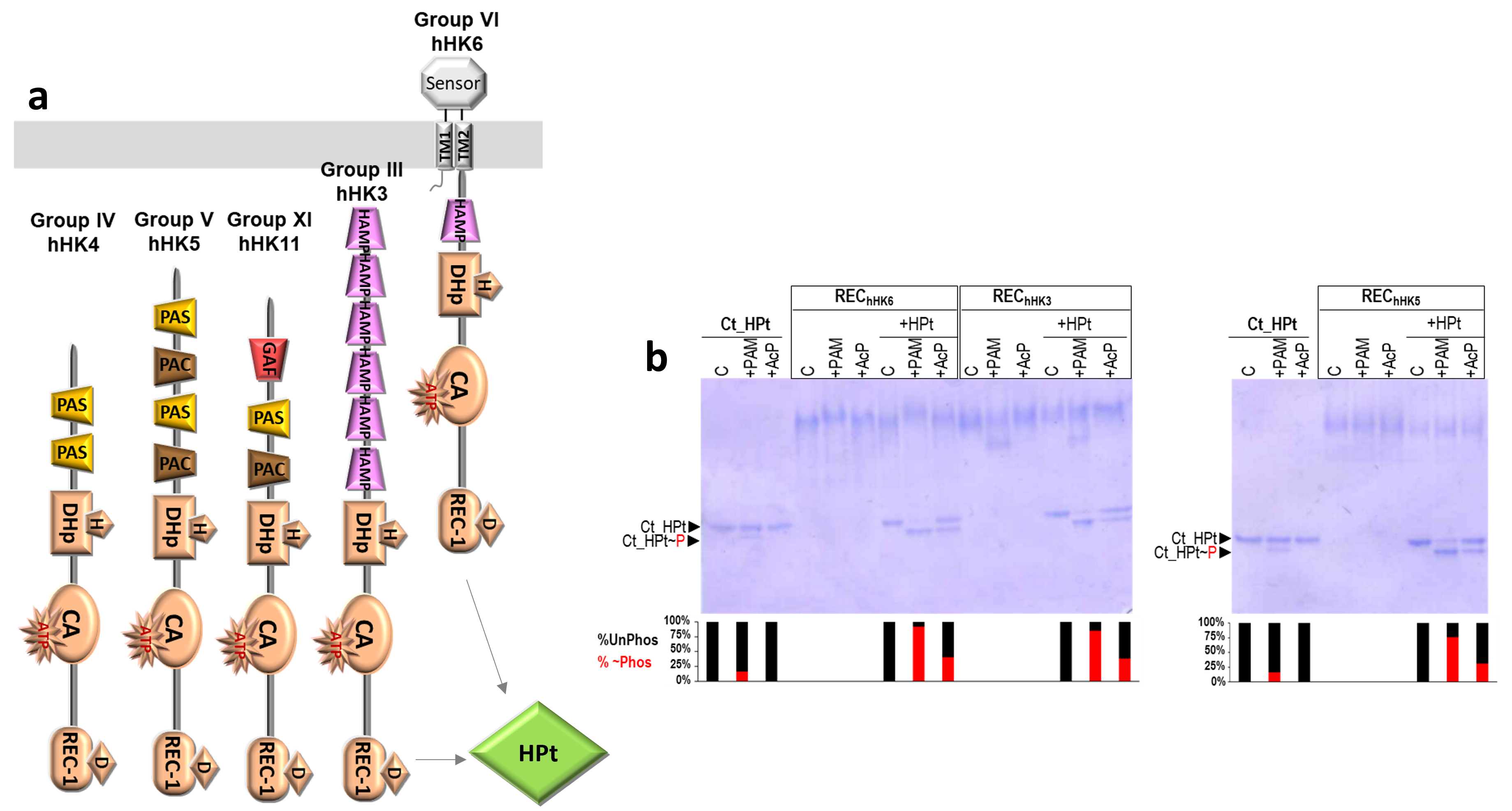 Fig.1. Phosphorelay systems in C. thermophilum. a) Schematic representation of domain organization of 5 hHKs that should phosphotransfer to HPt. b) Phosphotransfer experiments from 3 REC-1 domains phosphorylated with acetyl phosphate (AcP) or phosphoramidate (PAM) to HPt.