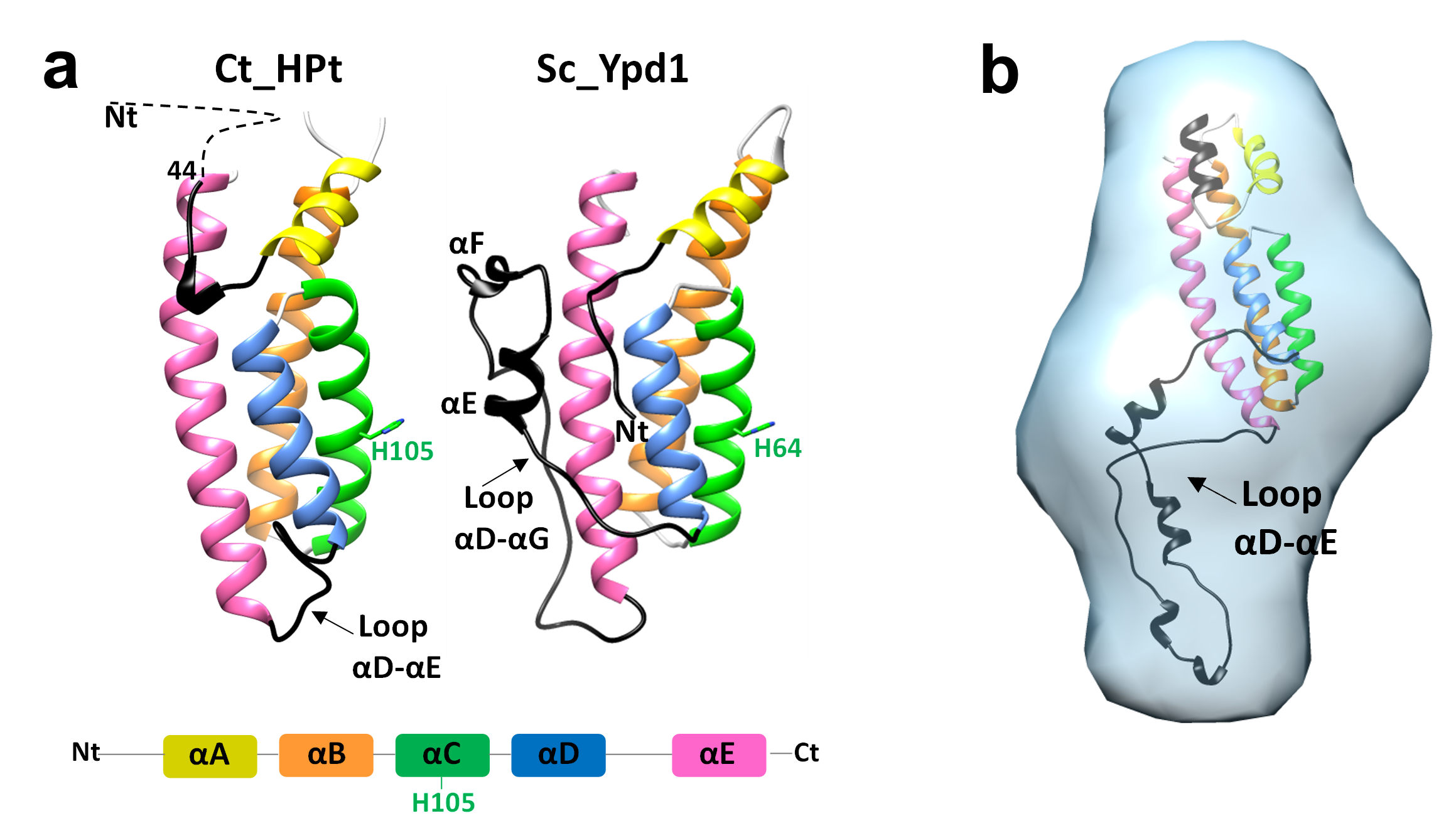 Fig. 3. Structure of HPt. a) Structural comparison between HPt from C. thermophilum and Ypd1 from S. cerevisiae. b) SEC-SAXS structure of Ypd1 from C. albicans fitting its model structure.