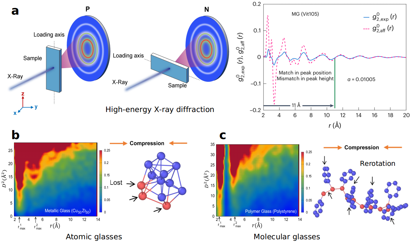 Figure 1: a Illustration of measuring the structural anisotropy with high-energy X-ray diffraction in experiments and the resulting anisotropic pair distribution function in metallic glasses. The local rearranging region can be determined by comparing the anisotropic term and the theoretical affine prediction. b Correlation of the structural anisotropy and nonaffine displacement field on atomic scale, and the associated bond-breaking events for the nonaffine arrangement in metallic glasses. c Similar correlation between the structural anisotropy and the nonaffinity, and the associated bond-reorientating events in polymer glasses.