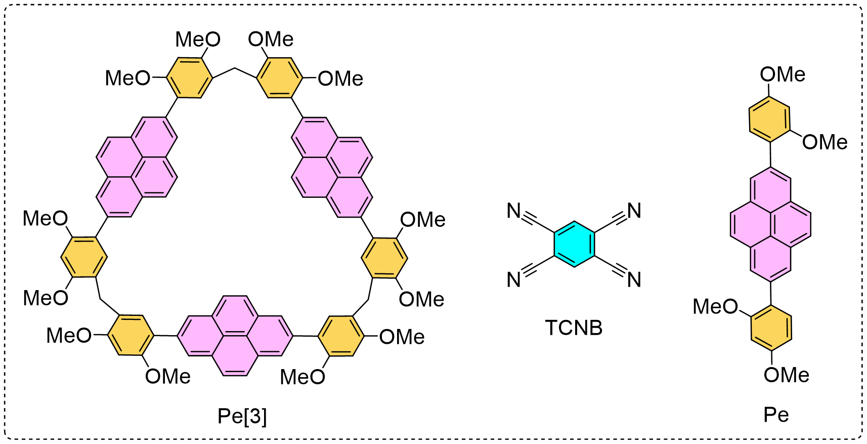 Fig. 1. Chemical structures. The components (Pe[3], Pe, and TCNB) of CT co-crystals.